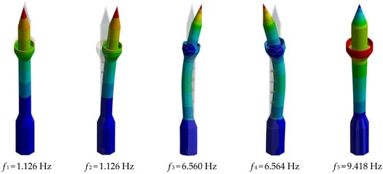 Following the model calibration process, the first five natural frequencies of the minaret were computed within the range of 1.126–9.418 Hz. The corresponding mode shapes obtained from the calibrated FE model exhibited deformation patterns consistent with those observed in the initial numerical model, indicating that the calibration process primarily refined the dynamic properties without altering the global modal characteristics of the structure as illustrated in Figure 8.