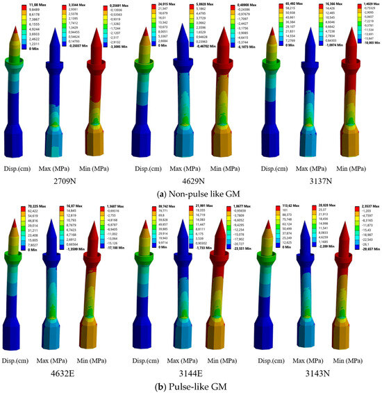 The displacement and stress contour distributions (i.e., maximum and minimum principal stresses) obtained under the corresponding seismological and intensity characteristics of PL and NPL near-fault ground motions are presented in Figure 11 for the initial model. Additionally, Table 2 summarizes the maximum displacement and stress demands obtained from the initial FE model. The combined evaluation of these results allows for a detailed assessment of the influence of ground-motion characteristics on the seismic response of the masonry minaret. The results clearly indicate a pronounced influence of pulse characteristics on both displacement and stress responses of the structure.