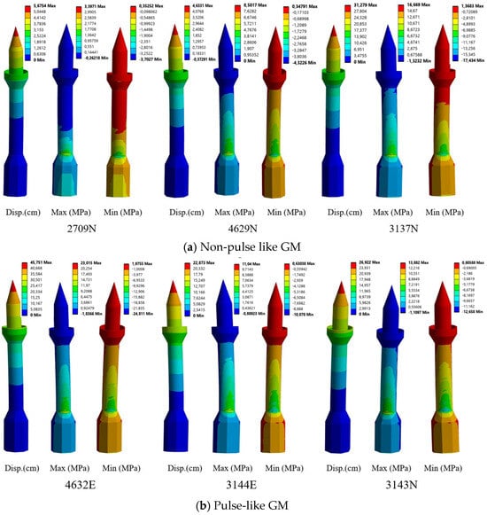 The displacement and stress contour distributions (i.e., maximum and minimum principal stresses) obtained under the corresponding seismological and intensity characteristics of PL and NPL motions are presented in Figure 12 for the calibrated model. The comparative results summarized in Table 2 and illustrated in Figure 12 provide insight into the influence of pulse effects on the seismic response of the masonry minaret after model calibration.
