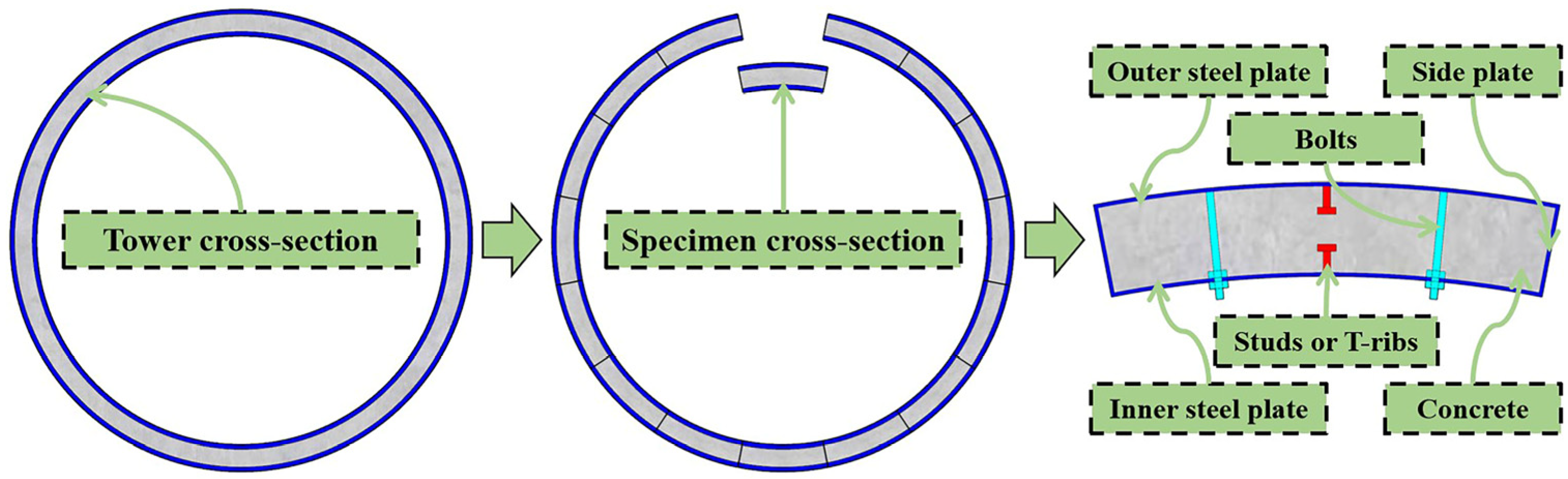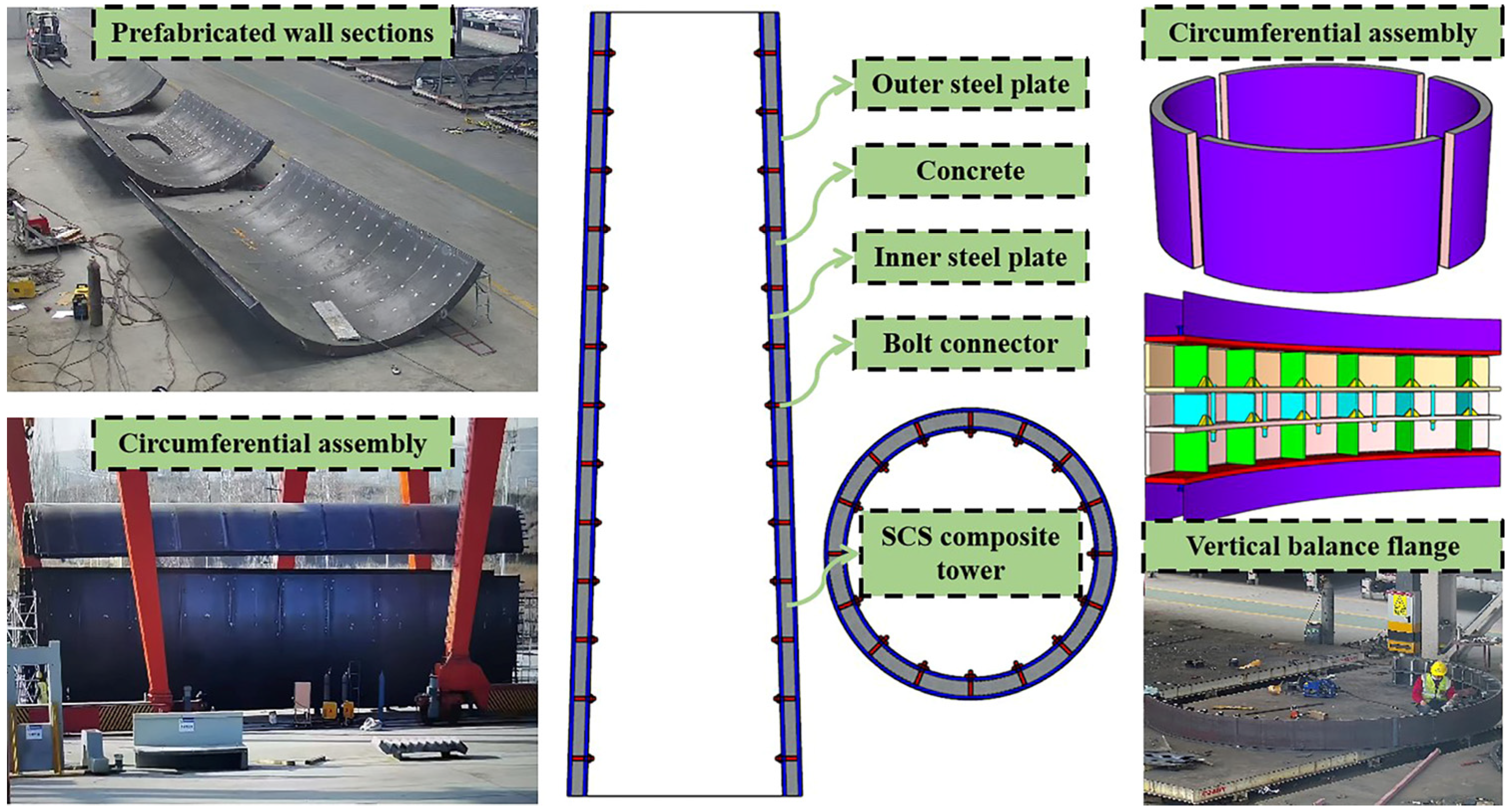 - Chen, J.; Zhao, S.Q.; Zhang, Y.; Tan, X.Y.; Zhang, B. Axial compressive performance of composite cylinder wall members in steel-concrete towers designed for wind turbines. J. Constr. Steel Res. 2024, 221, 108908. [Google Scholar] [CrossRef]