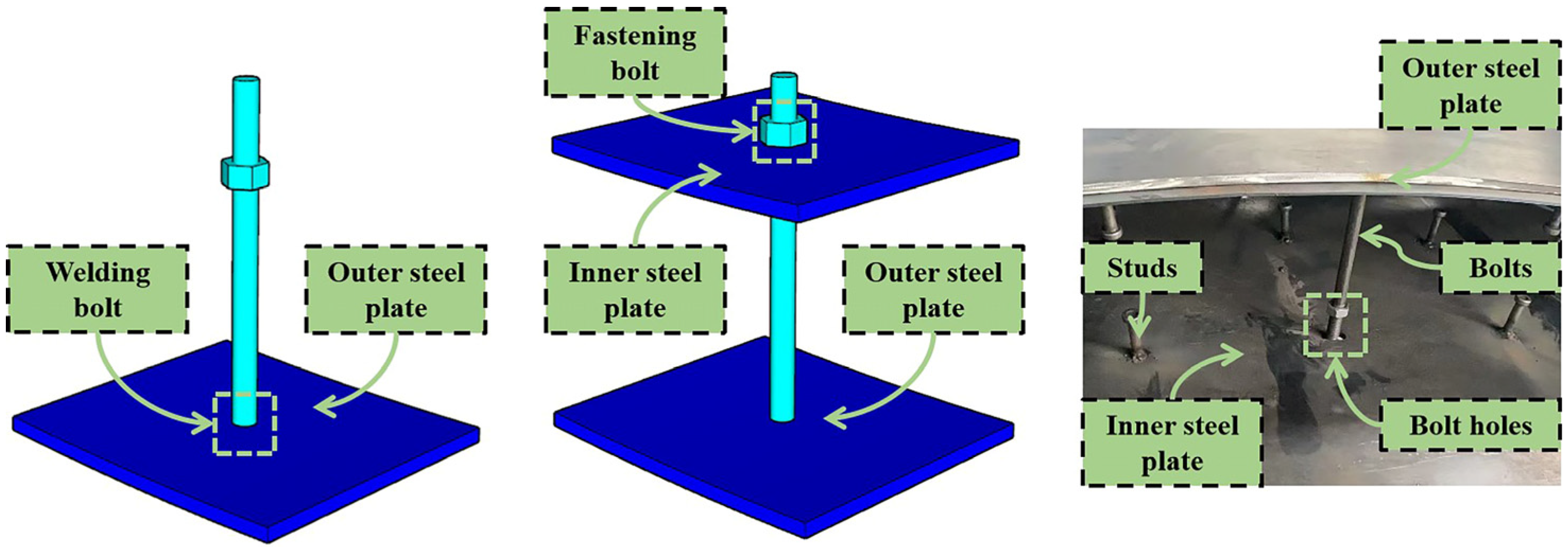 - Ayough, P.; Ibrahim, Z.; Jameel, M.; Alnahhal, A.M. Axial compression behaviour of circular concrete-filled double-skin steel tubular columns with bolted shear studs: Numerical investigation and design. J. Constr. Steel Res. 2023, 205, 107911. [Google Scholar] [CrossRef]