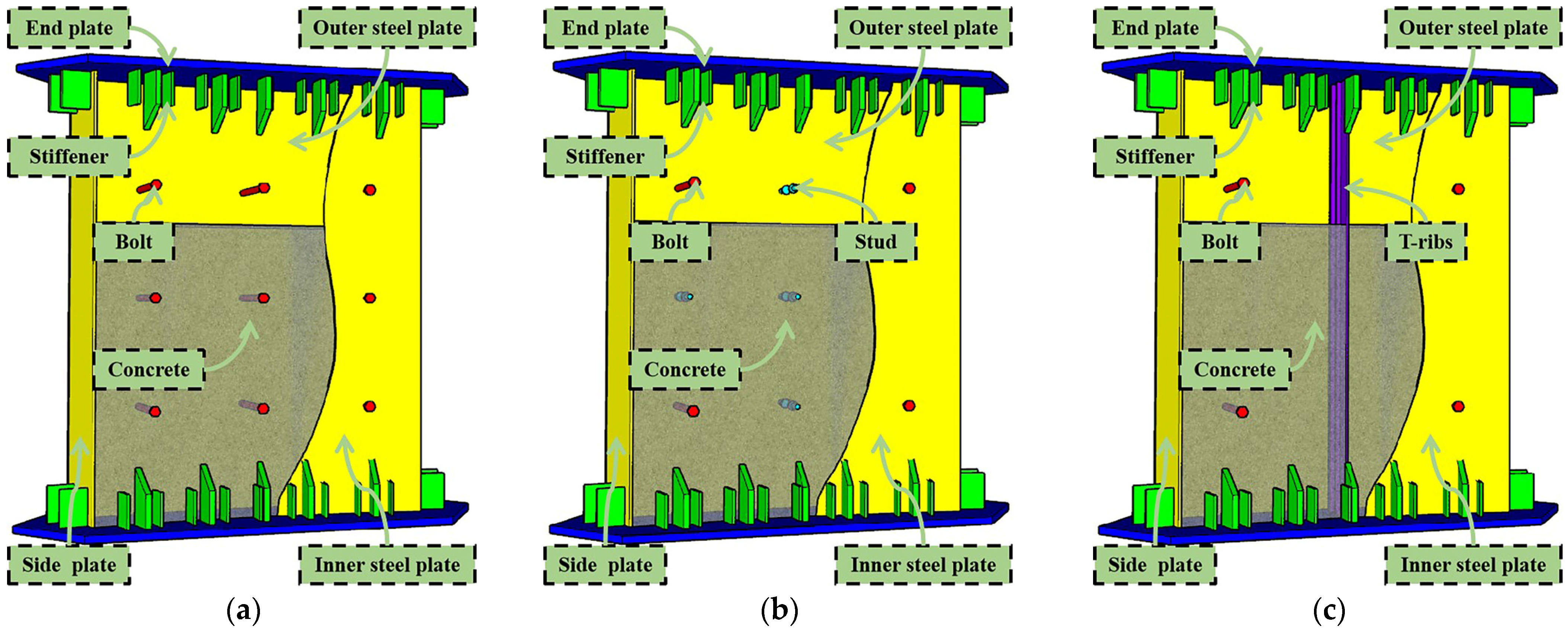 - Ayough, P.; Ibrahim, Z.; Sulong, N.H.R.; Ganasan, R.; Ghayeb, H.H.; Elchalakani, M. Experimental and numerical investigations into the compressive behaviour of circular concrete-filled double-skin steel tubular columns with bolted shear studs. Structures 2022, 46, 880–898. [Google Scholar] [CrossRef]