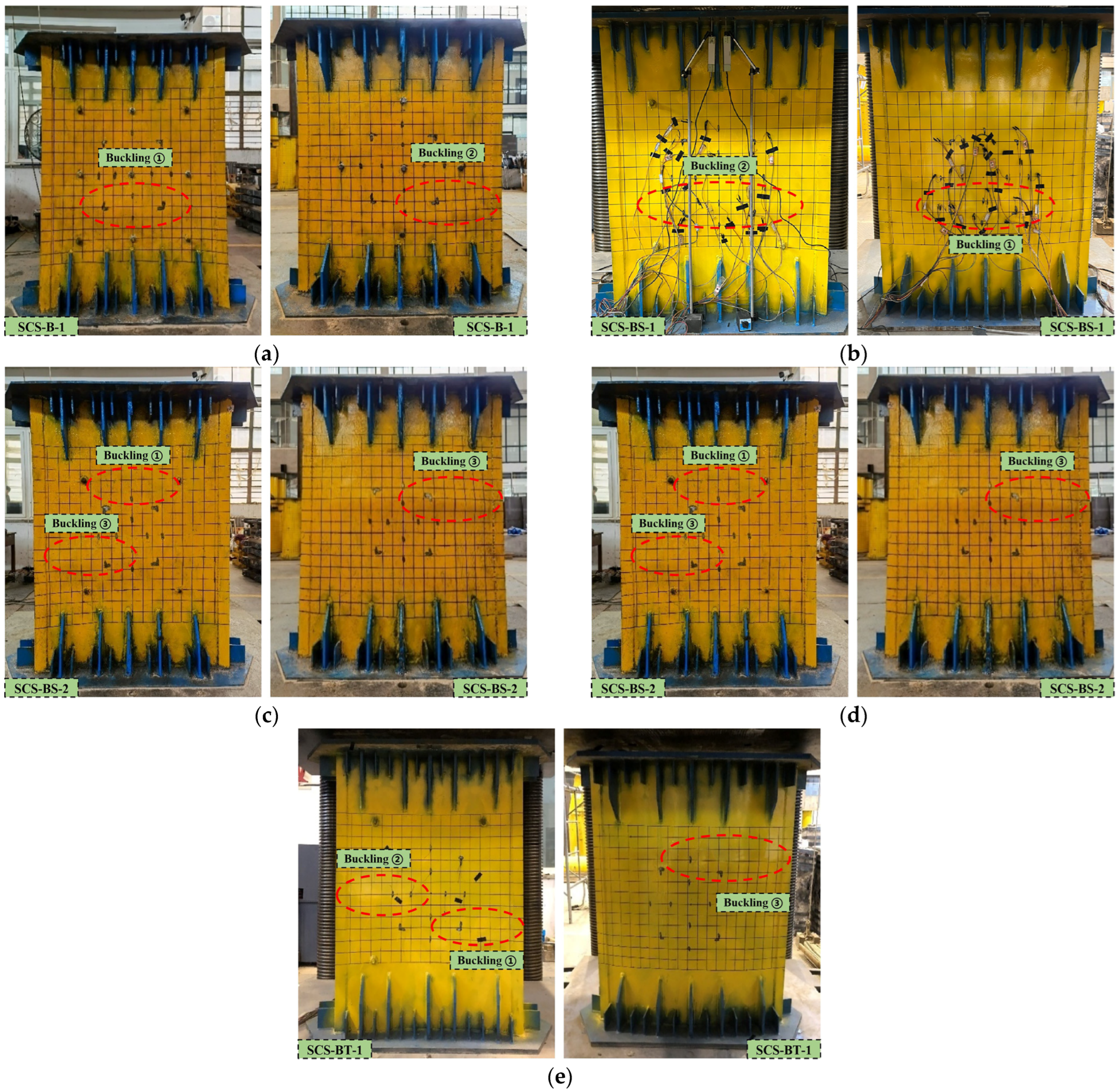 - Yu, Y.; Shi, J.; Cai, L.J.; Guo, L.H. Study on buckling behavior of steel plate in double-skin steel plate concrete composite walls under compression. Prog. Steel Build. Struct. 2024, 26, 37–45. (In Chinese) [Google Scholar] [CrossRef]