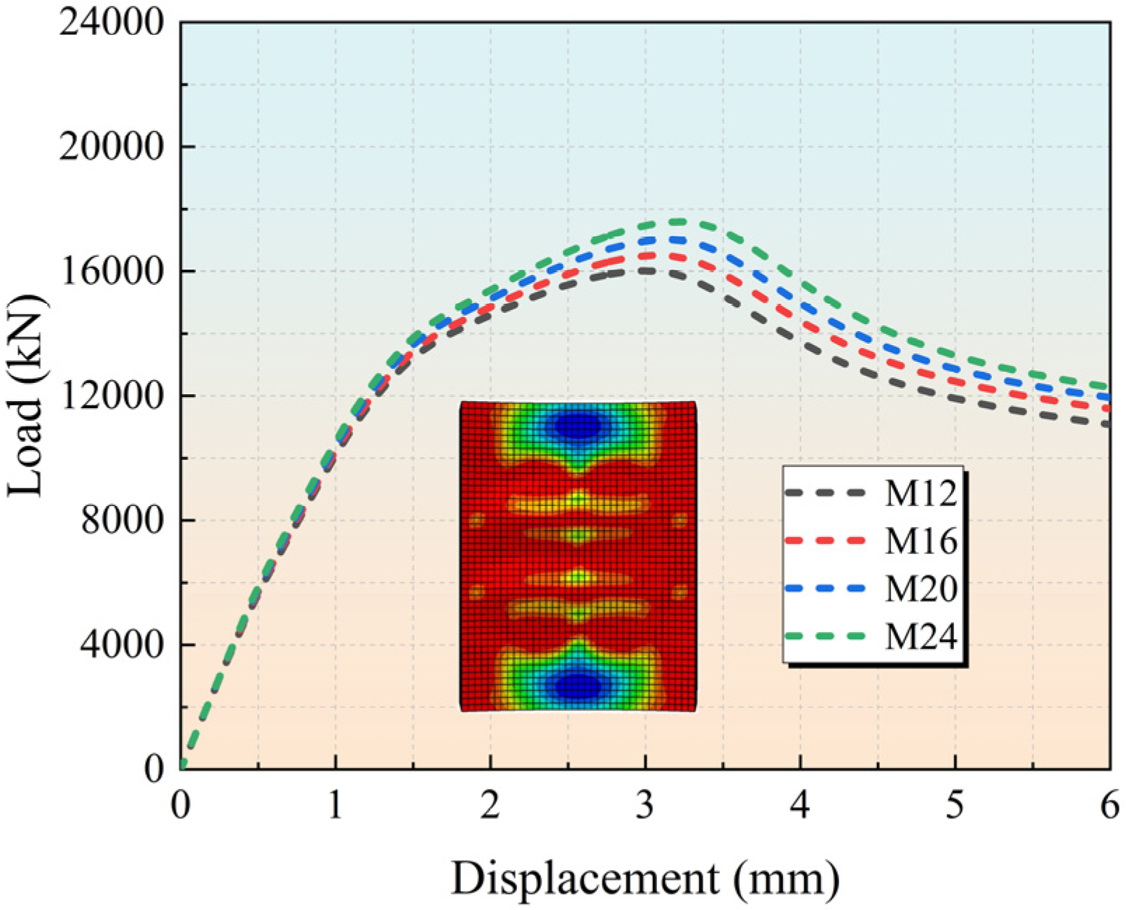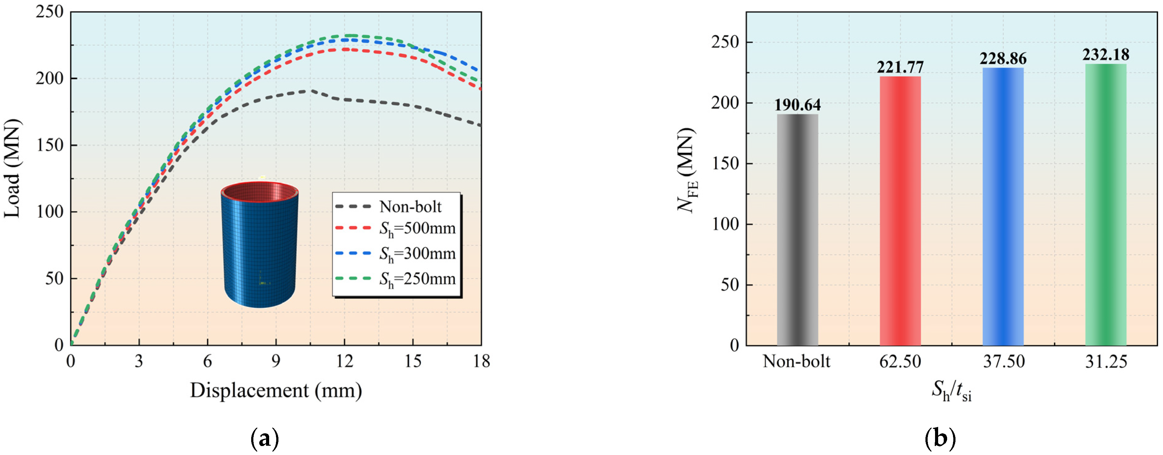 - Numerical models were established and validated against experimental results. Parametric analysis indicated that increasing the bolt diameter from 16 mm to 12 mm, 20 mm and 24 mm enhanced the ultimate load by −2.95%, +3.09% and +6.58%, respectively.