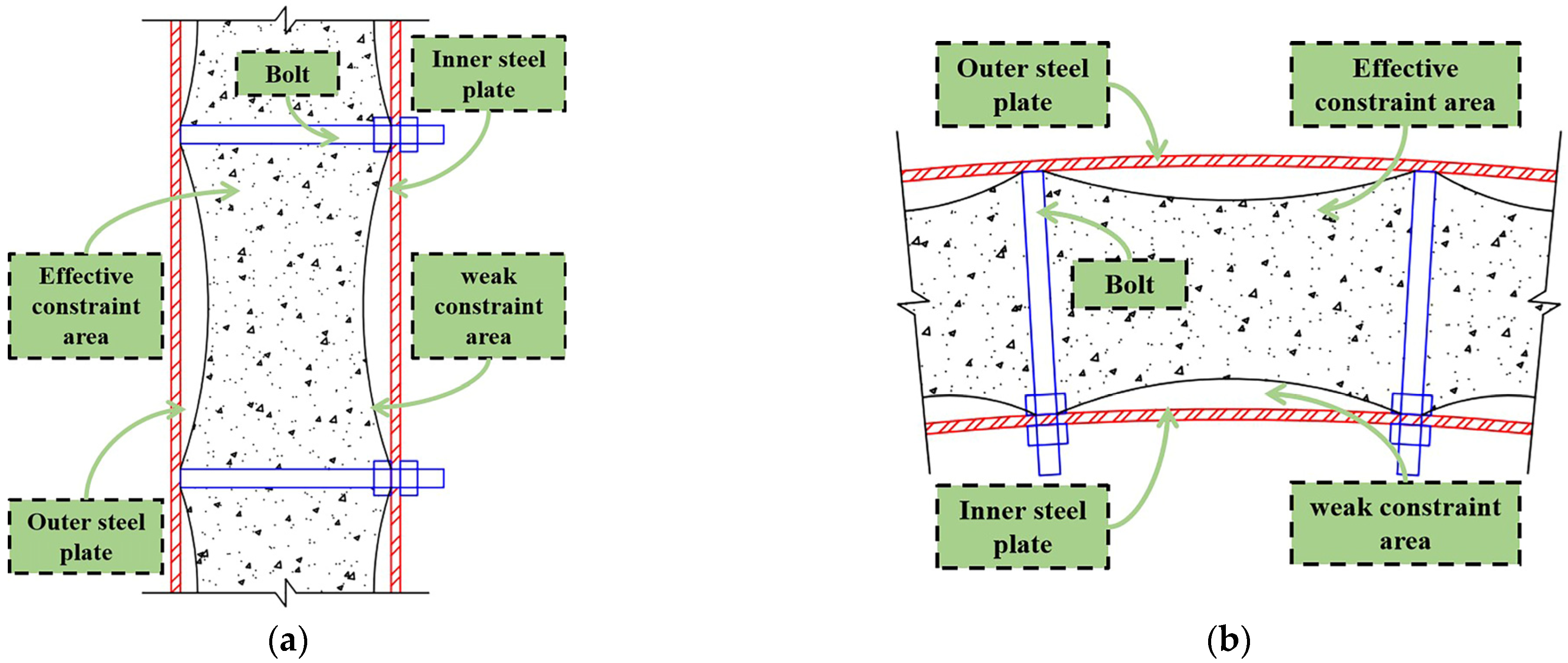 - Full-section numerical analysis revealed that reducing bolt spacing significantly increased ultimate capacity, although the incremental benefit decreased as spacing became smaller, indicating a saturation effect in connector-induced confinement.