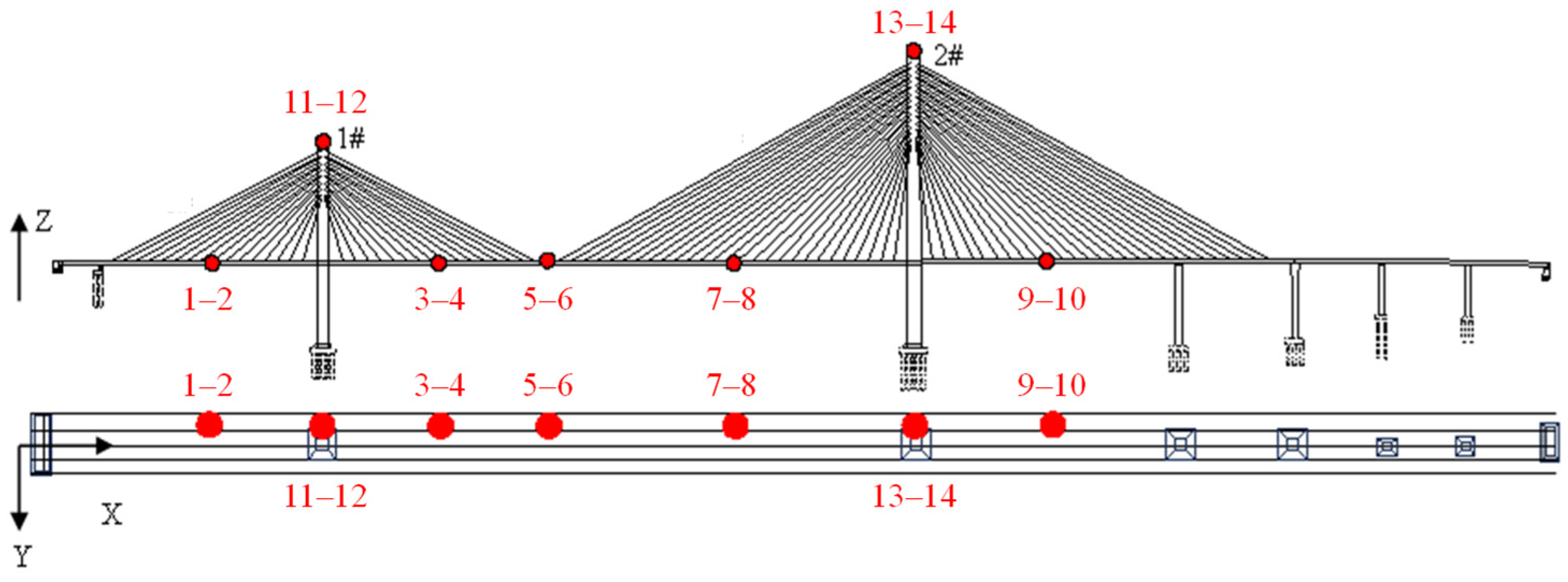 | 3–4 | The main beam at the 1/5 span of the main span | X, Z |