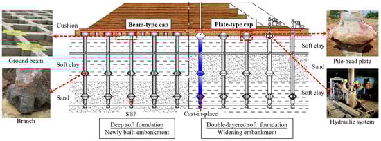 The load tests highlight the greater bearing capacity of individual SBPs; the responses of SBPs beneath embankments have not been sufficiently explored. Embankment loading is flexible, comprising both vertical and horizontal loads that differ from rigid loading conditions [21]. Moreover, the enlarged branches of SBPs typically necessitate a wider Sp, which in turn demands a properly designed pile-head structure to transfer embankment load across the spaced piles. While the behavior of pile-head structures in conventional RPSEs is generally well-understood [1,2,21], there remains a research gap regarding the pile-head structures (Figure 1) of SBPs, where the distinction between the beam-type cap and the plate-type cap for SBPSEs has not been clearly distinguished. The beam-type cap is a continuous, strip-like concrete element that interconnects a row of piles [2,22,23]. For instance, in full-scale tests on the Chaoshan Ring Expressway, Liu [24] reported that squeezed branch pile-supported embankment (SBPSE) with a beam-type cap, employing a wider spacing (Sp = 4.0 m), outperformed capped pipe piles with tighter spacing (Sp = 2.8 m) in load bearing. The plate-type cap is conceptualized as an enlarged, branch-shaped section formed at the pile head. It functions as a built-in pile cap, and Li [25] observed that SBPSE with a plate-type cap exhibited improved load distribution, with 70% of the load being carried by the piles. In the SBPSEs system, the miniaturized SBPs makes the pile-head structure decisive for raising the replacement ratio. Therefore, clarifying the role of pile-head structure is urgent.