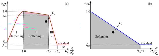The softening and hardening behavior of the concrete is governed by the evolution of this failure criterion. Specifically, the contraction/expansion of the yield surfaces (Figure 2) lead to hardening/softening variations in normalized stress–strain curves [29,32], as shown in Figure 3. This process is controlled by the normalized compression hardening parameter (Hc) and the normalized tension hardening parameter (Ht). The parameters define as Hc = / and Ht = /, where is the minor (compressive) principal plastic strain and is the plastic peak strain in uniaxial compression, and is the major (tensile) principal plastic strain and is the plastic peak strain in uniaxial tension.