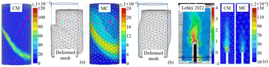 Figure 5a,b display the deformed mesh and the contours of deviatoric strain (γs) from the UCST simulation using both the MC and CM. During uniaxial compression, concrete specimens typically develop a distinct slant shear band. However, the MC fails to adequately capture this shear localization, resulting in a failure pattern that deviates from the physical observations [43]. By accounting for the strain-softening behavior, the CM produces a more pronounced and realistic shear band within the concrete specimens. The contours of γs of notched specimens obtained numerically and experimentally in the 3PBTs are compared in Figure 5c. The proposed CM adequately captures the potential crack path, as both the magnitude of γs and strain localization at the notch closely align with experimental observations [35]. These comparisons confirm that the CM, with its refined parameters for C30 concrete, is capable of simulating the strain-softening behavior and crack development.