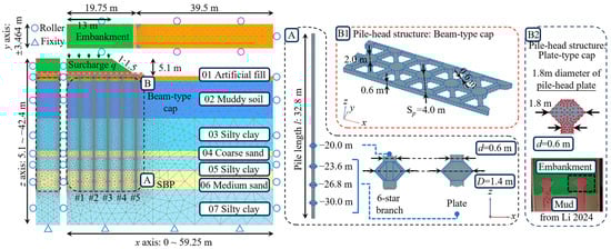 The SBPs and beam-type cap in the numerical model closely replicated the in situ scheme, as shown in Figure 7. Both the SBPs and pile-head structures were modeled as solid volumes using the concrete constitutive model with the refined parameters tabulated in Table 1. Interface elements were incorporated along the periphery of pile shaft and branches to simulate pile–soil interaction. An elastoplastic interface model was adopted, where the strength and stiffness were scaled by a reduction factor (Rinter) [32,48]. For the beam-type cap, a rigid connection to the pile was assumed, and thus there was no dedicated interface for the pile-head structure. The plate-type cap—another pile-head structure in this study—is displayed on the right side of Figure 8. This structure, formed by hydraulically expanding the pile shaft at the top to create a plate, serves as a pile cap [25], and was assumed to have a diameter of 1.8 m in this simulation. A two-layer biaxial geogrid reinforcement was installed above both pile-head structures [24,44] (at elevations of 0.3 m and 0.6 m), with an isotropic axial stiffness (EA) of 1500 kN/m. The piles, pile-head structures, and soil volumes were meshed using 10-node tetrahedral elements. Then, 12-node joint elements were employed for the pile–soil interfaces, and 6-node triangular surface elements were used for geogrids. A graded meshing scheme was adopted, wherein the mesh was coarsened with increasing distance from the reinforced foundation zone. The mesh coarseness factors were set as follows: 0.30 for the SBPs, interfaces, and the immediate surrounding soil; 0.50 for the embankment fill; 0.75 for the soft clay within the foundation; and 1.50 for the bottom silt clay.