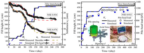 The field-measured [24,44] and numerically simulated embankment filling sequences (time t—fill height He) for the two interchanges are shown in Figure 9, represented by the black and blue solid lines. Accordingly, the SBPSE model was validated by comparing the simulated and measured settlement uz and pile-head load.