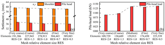 To enhance the precision of the numerical simulation, five different mesh relative element sizes (RESs) were tested. Mesh sensitivity is critical when dealing with intricate geometries. The mesh convergence analysis concerning uz and pile-head load confirmed that the mesh size optimization had no impact on the results, as shown in Figure 10. These two fundamental variables are directly related to the subsequent analysis and are based on field measurements. Based on a range of RESs from very coarse to very fine, a medium mesh size was selected for simulations under various conditions. This ensures that the simulation remains both accurate and computationally efficient, with the overall model containing approximately 159,963 elements and 278,913 nodes.