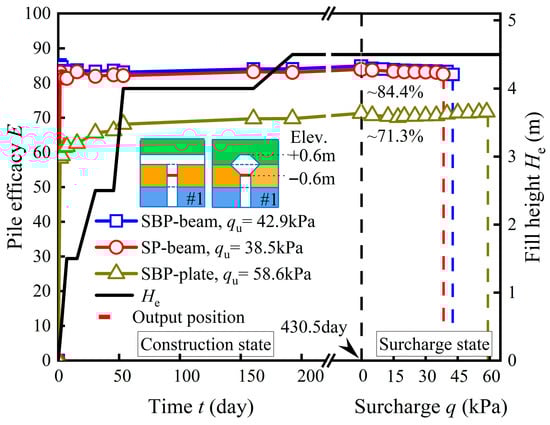 Figure 12 illustrates the variation in pile efficacy (E) [53] at the pile head of the central pile #1 with time t and surcharge q. Notably, the plate-type cap significantly enhances the ultimate surcharge capacity qu, with the corresponding SBPSE sustaining a qu of 58.6 kPa, which is approximately 36% higher than that of the beam-type cap systems in the studied case. This magnitude of the ultimate surcharge qu differs from the settlement patterns revealed in Figure 11. The efficacy E represents the percentage of total embankment load within a replacement area that is carried by the pile. The E curves for all three systems show an initial phase of exponential increase, which transitions to a stabilized plateau after the fill height He reaches approximately 2.0 m. The curves for SBP-beam and SP-beam follow comparable trends and reach similar magnitudes. Upon completion of construction, the efficacy E for both beam-type cap systems reaches 84%, which is approximately 13% higher than that of the plate-type cap. In stark contrast, the E curve for the SBP-plate exhibits a distinct behavior during the surcharge stage, rising gradually from 60 to 73%, which underscores the qualitatively different load-transfer mechanism.