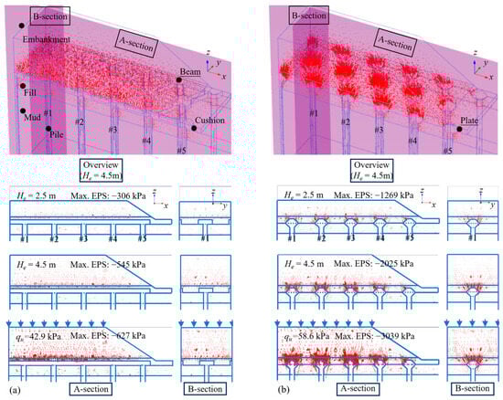 As the filling and surcharge progress, the concentration of EPS around the pile-head plate becomes increasingly pronounced, indicating the development of a robust stress arch. This phenomenon correlates well with the settlement uz contours in Figure 11. The steep settlement gradients around the pile-head plate signify substantial differential settlement, providing direct evidence for the activation of soil arching and the consequent redistribution of stresses. The simulated response indicates a less pronounced soil-arching effect in the beam-type cap system than conventionally expected [21], with a weaker correlation between the mobilization of load and the development of soil arching. This is attributed to the specific configuration of SBPs, notably the pile spacing Sp and the presence of ground beams. Consequently, this system can be interpreted as behaving like a pile-beam foundation, transferring the embankment load primarily through the concrete structure. In contrast, the plate-type cap system provides evidence of significant plate–embankment interaction. This interaction appears to engage the plate cap, the underlying SBPs, and the surrounding soil, suggesting an integrated composite foundation.