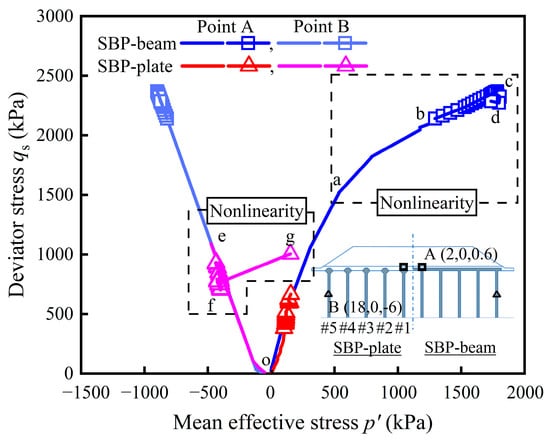 The nonlinear variation in the stress paths reveals the complex mechanical behavior within the structures. In Figure 14, the stress paths of these two representative points display distinct nonlinear characteristics. For Point A in the beam-type cap, the nonlinear evolution occurs in three successive stages: (1) initial compressive hardening (a–b): The stress path curve transitions from linear to nonlinear during the construction state; (2) progressive plastic flow (b–c): The curve gradually flattens, approaching a yield plateau in the surcharge state; (3) post-peak strain-softening (c–d): The stress path begins to drop sharply as the concrete undergoes failure and loss of strength. For Point B in the SBPs beneath the plate-type cap, the development of nonlinear behavior follows a different pattern: (1) tensile softening (e–f): The path descends with a steeper slope, indicating a rapid loss of tensile strength and the initiation of internal damage in the surcharge state; (2) stress redistribution and compressive mobilization (f–g): The stress path subsequently exhibits a V-shaped reversal, likely due to extensive cracking that redistributes forces and engages the concrete in compression. These contrasting stress paths clearly illustrate the differing progression of yielding at these representative points in compressive and tensile behaviors.