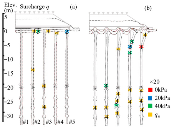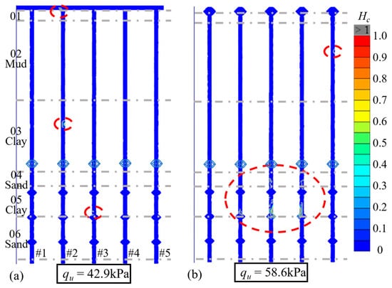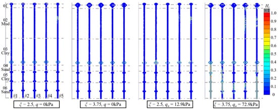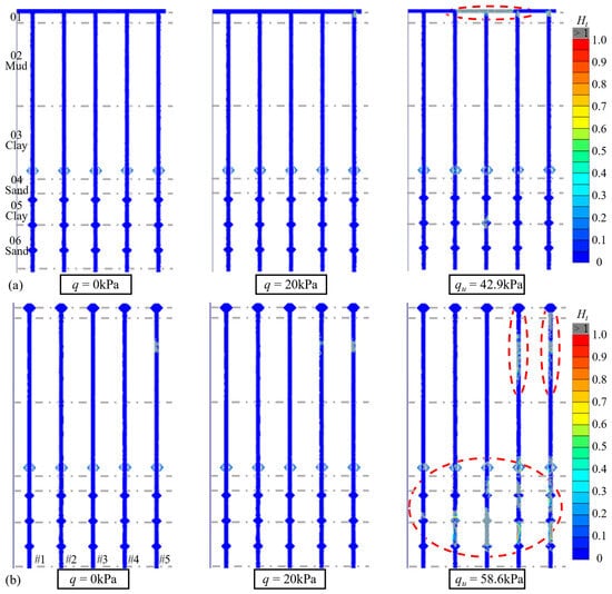 Figure 15 illustrates the contours of normalized tension hardening parameter Ht at varying surcharge q within the SBPSEs. In these contours, regions where Ht > 1 are shaded gray, indicating that the concrete is undergoing softening (Figure 3b) and enters a state of tensile yielding. For the SBP-plate (Figure 15b), the tensile yield zone initially emerges at the mid-height of the toe pile #5 when q = 0 kPa. This phenomenon suggests that, during the construction state, tensile yielding begins at the toe pile #5, revealing that the embankment system has already experienced degradation. Such construction-induced effects are typically overlooked in previous numerical studies [4,28,31] of embankment stability. As q increases, this yield zone propagates inward to the adjacent pile #4. Upon reaching qu, the tensile yield zones in piles #4 and #5 coalesce, forming a continuous band within the Mud layer. Concurrently, extensive tensile yielding develops in the lower sections of the SBPs.