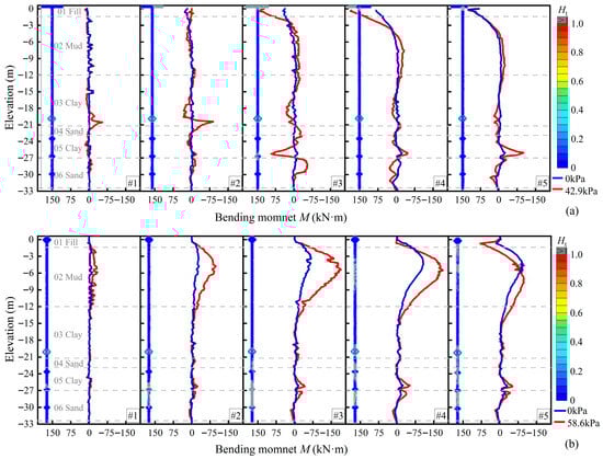 Bending moment M along the pile shaft: (a) SBP-plate; (b) SBP-beam.