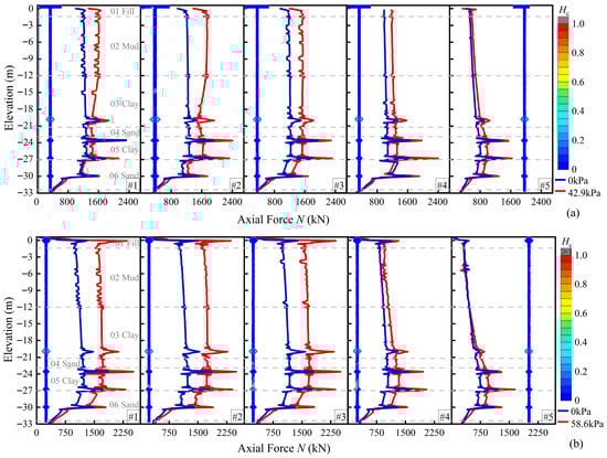 Axial force N along the pile shaft: (a) SBP-beam; (b) SBP-plate.