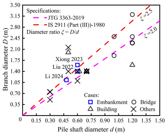 To systematically investigate the influence of the pile-head plate diameter, a dimensionless parameter termed diameter ratio ξ (the ratio of the plate diameter D to the pile shaft diameter d) was introduced. In preceding simulation, the plate-head diameter, where the D and the d were fixed at 1.8 m and 0.6 m, was assigned ξ = 3; the other branches along the pile shaft were assigned ξ = 2.5. A practical range for parametric study was established from the ξ values in Figure 20, which compiles the diameter data of SBPs from 23 engineering cases of SBPs; the recommended ξ values from the specifications JTG 3363-2019 [55] and IS: 2911 (Part III)-1980 [56] are included as reference. The collected data reveal a considerable scatter in the ξ values, as shown in Figure 20. For embankment applications, the diameter d is typically constrained between 0.4 m and 0.6 m. As the pile-head plate functions similarly to a pile cap, a relatively high ξ is warranted to ensure effective load spreading. Consequently, six levels of ξ (2.5, 2.75, 3, 3.25, 3.5 and 3.75) for the pile-head plate were selected for comparative analysis; the shaft diameter d and the diameter of lower branches D were fixed at 0.6 m and 1.4 m, respectively, while the pile spacing Sp was maintained at 4.0 m.