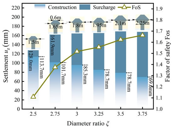 Figure 21 illustrates the variation in settlement uz at the shoulder and FoS with ξ of the pile-head plate. The bar chart shows that the total uz in both construction and surcharge states increases with ξ, but no substantial additional benefit is observed when ξ exceeds 3.0 in this model. Furthermore, the uz during the construction state decreases continuously as ξ increases, ultimately reaching 69.6 mm at ξ = 3.75. From the line chart, the FoS exhibits a gradually increasing trend with ξ, though the rate of this increase gradually slows down, particularly at ξ = 3.0, highlighting a critical point within the context of this study. Specifically, when ξ is reduced to 2.5, the FoS drops sharply to 1.18. These two phenomena indicate that the pile-head plate diameter is a governing factor for the stiffness of the SBPSE during the construction state. Beyond a certain threshold (ξ > 3.0), however, its contribution to enhancing the ultimate surcharge resistance becomes limited.