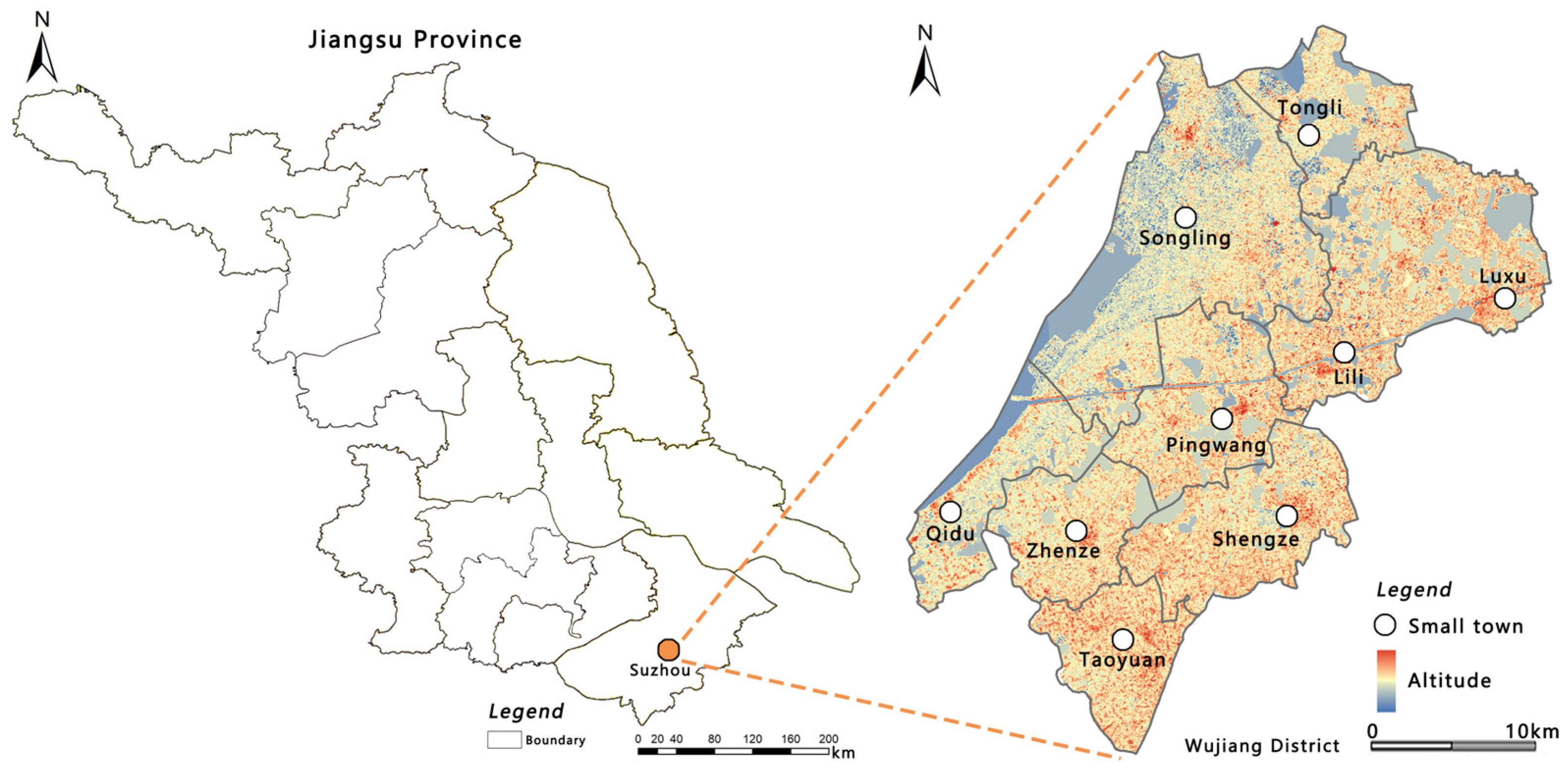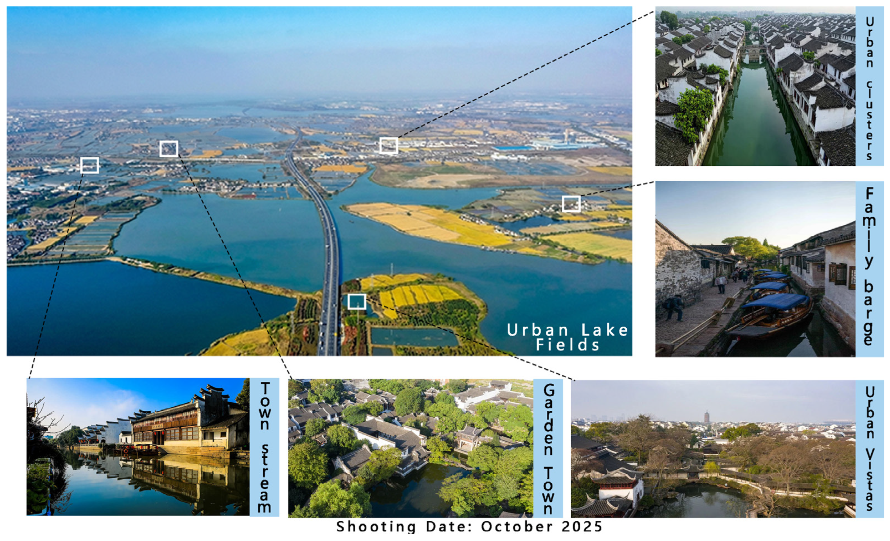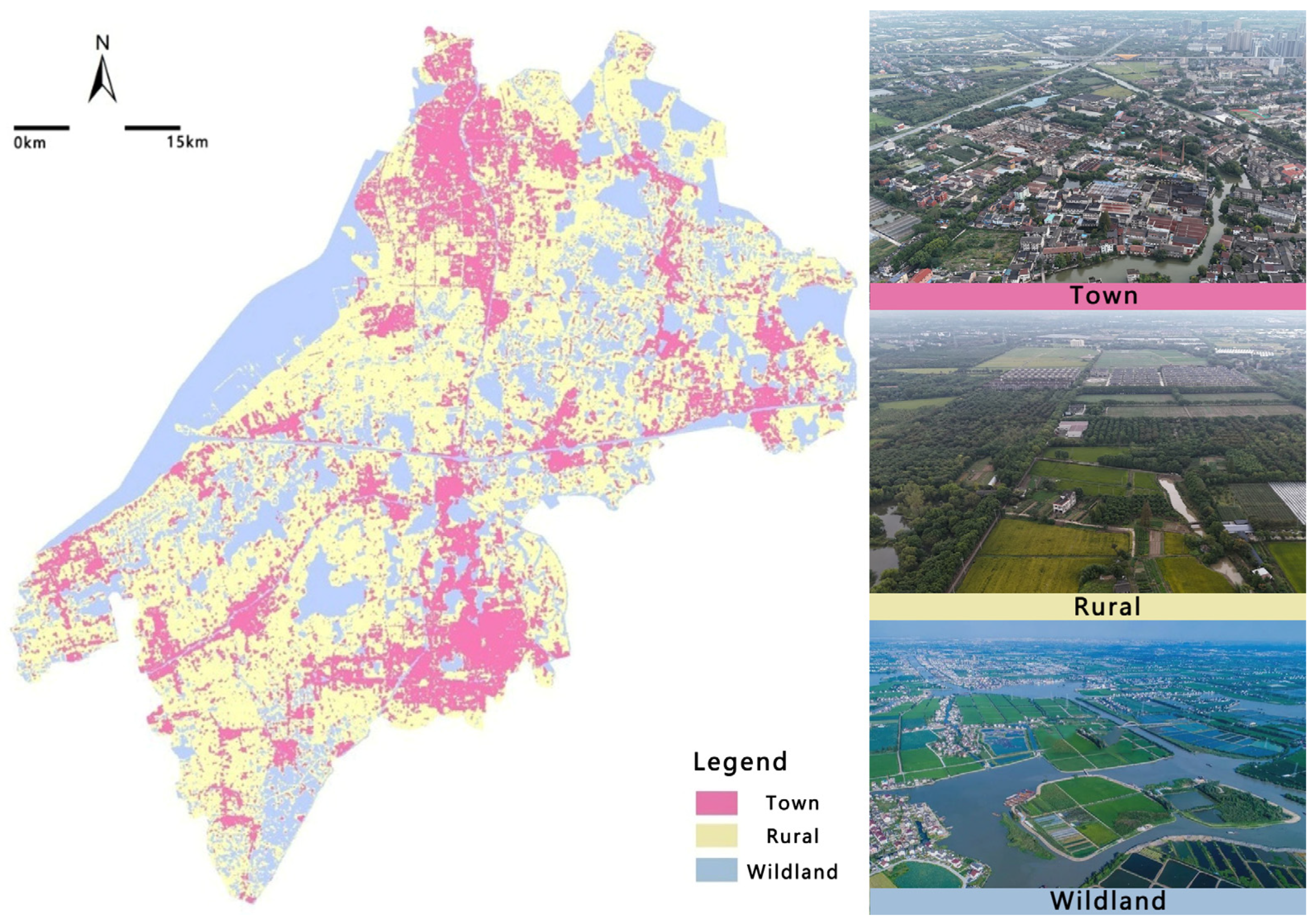 In this study, “Urban–Rural–Wilderness” refers to a spatial continuum rather than an administrative category. It describes the gradual transition in morphology, land use, and landscape characteristics from urbanized town centers, through rural settlements, to less-developed wilderness areas. This continuum captures both functional interdependence and environmental variation, and is particularly relevant in regions such as Wujiang, where historic water towns coexist with expanding peri-urban industrial and agrarian landscapes. Wujiang’s small towns exhibit distinctive water-town morphology shaped by longterm human–water interactions. Key characteristics include: a hybrid town–rural condition (both urban and rural attributes coexist); a ‘field–woodland’ (farmland–tree belt) texture integrated into settlements; a dense water-network system formed by lakes, canals, and distributaries; river–lake coupling that organizes daily life and settlement layout; a ‘small bridges–flowing water–waterside households’ streetscape formed by bridges, canals, white-walled black-tiled dwellings, and waterside lanes; a small-scale, low-rise, medium-density built form; and an increasingly blurred boundary among town, countryside, and wilderness, where farmland and semi-natural spaces surround and permeate the town fabric (