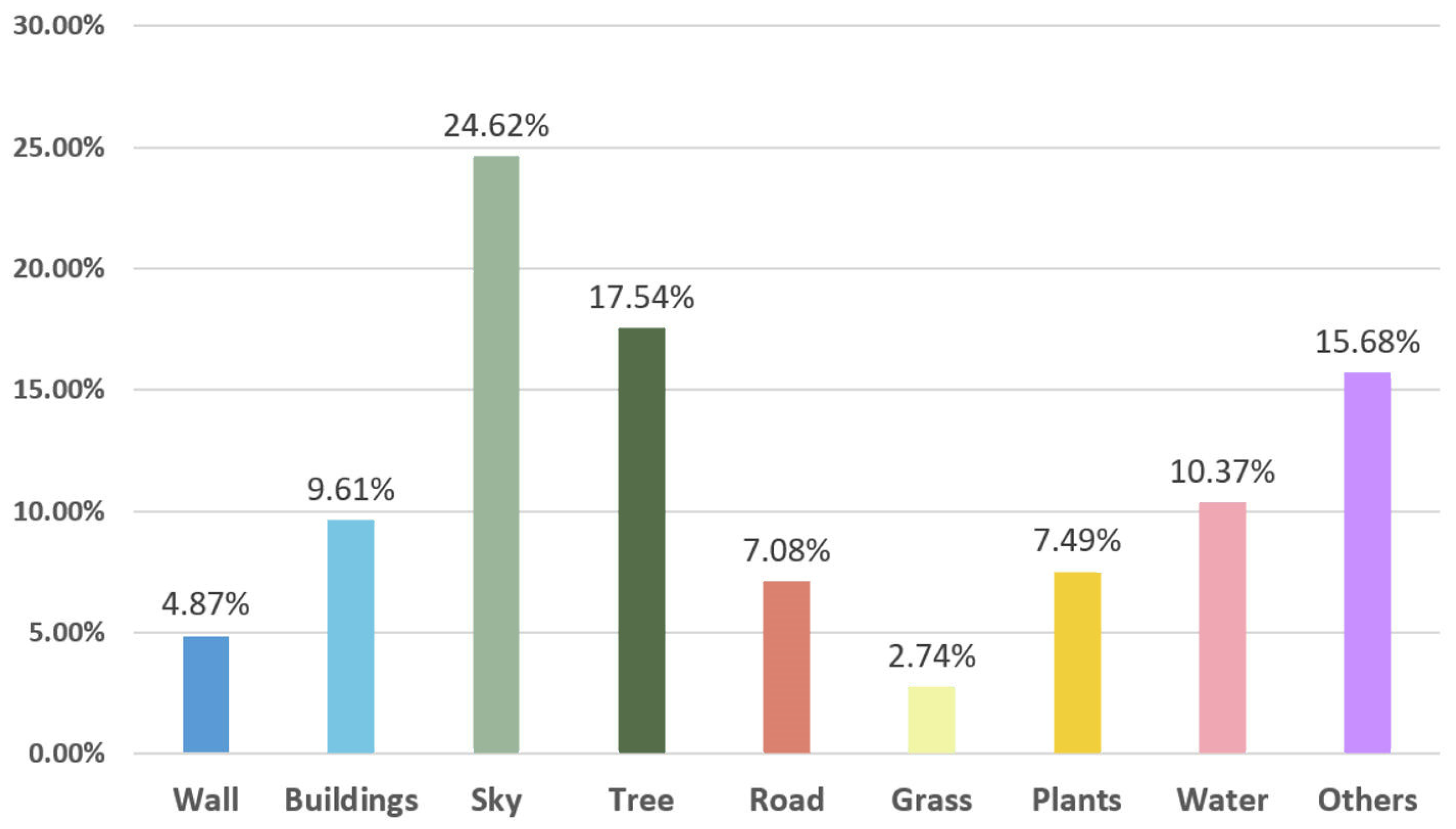 Figure 6), four elements—sky, water surfaces, trees, and buildings—formed the primary group of observable physical-environment features. Together, these four elements accounted for 62.14% of all identified pixels. They can therefore be regarded as the dominant compositional elements of the street-view environment, as well as the primary objective environmental features visible to observers.