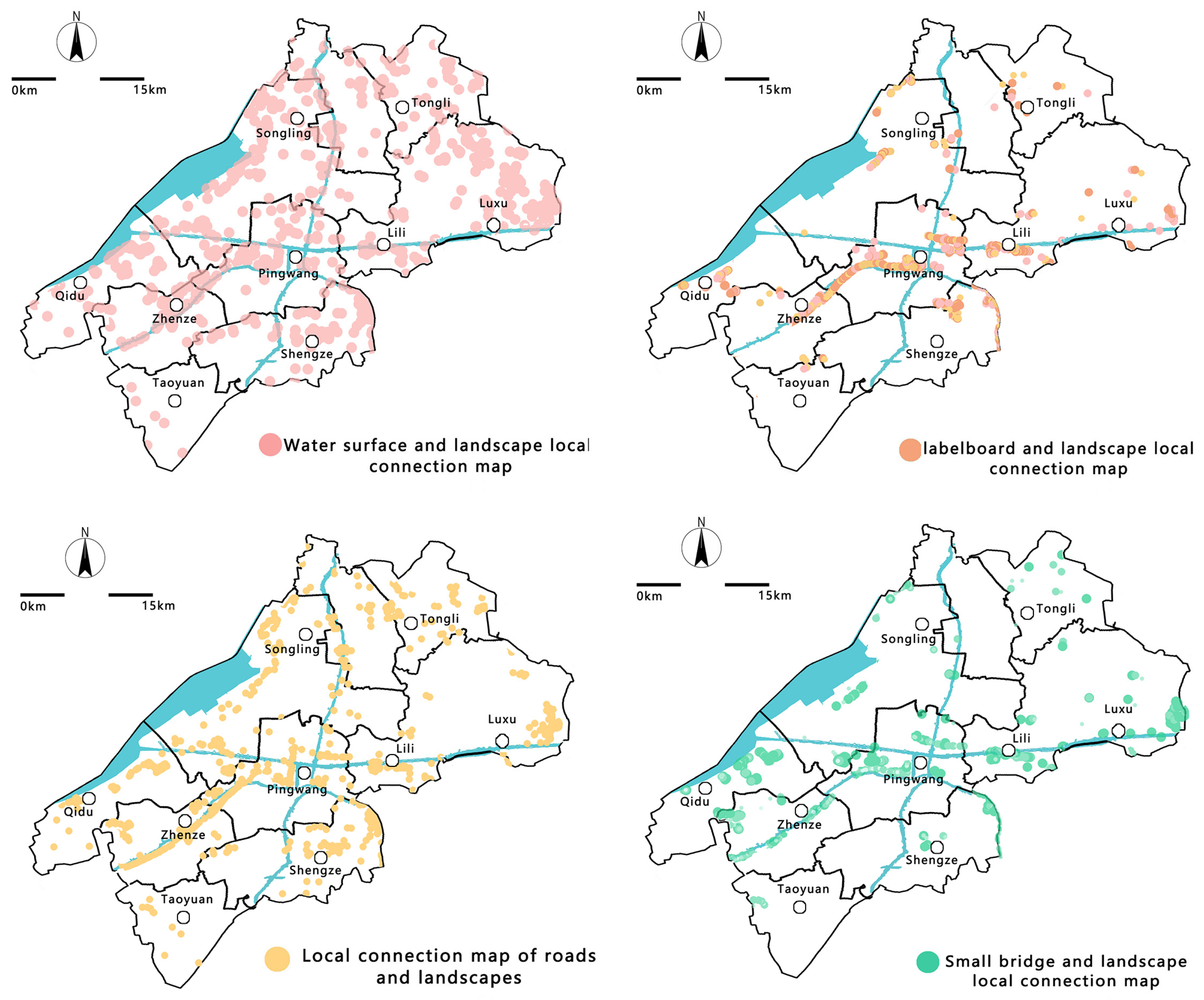 According to the study, spatial variability in the landscape-locality scores of small towns in Wujiang District is evident, influenced not only by subjective environmental perceptions but also by their spatial correlation with the proportional distribution of local landscape elements. As previously discussed, the analysis indicates a significant correlation between the proportional distribution of the 17 landscape categories and landscape-locality scores, with different categories exhibiting either positive or negative associations.