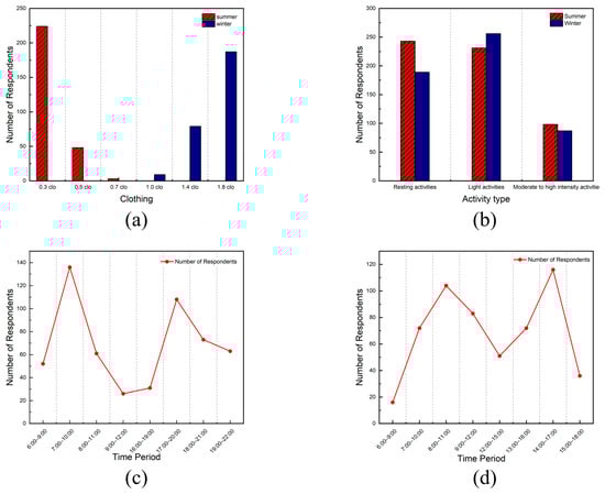 Questionnaire survey results: (a) dressing habits; (b) types of activities; (c) time periods of summer activities; (d) time periods of winter activities.