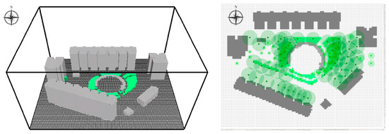 3D Model Construction and Material Properties: A precise three-dimensional model was built in the ENVI-met SPACES module based on field-measured site plans, as shown in Figure 4. The model included five surrounding residential buildings (shown in gray in Figure 4) and the central square area with its components (green belts shown in green in Figure 4, walkways, pergola, and activity plaza). Building material properties were assigned according to their brick-concrete structure. Parameters for pavement materials (albedo, thermal properties) and vegetation (Leaf Area Density, plant albedo) were set by referencing the software’s built-in database and calibrated with field observations. A summary of the final boundary conditions and key parameter settings is provided in Table 1.