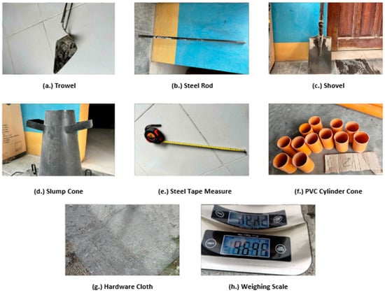 Figure 2 shows the equipment used in the experiment, including a trowel (Castillanes Construction and Supply, Esperanza, Philippines), steel rod (Castillanes Construction and Supply, Esperanza, Philippines), shovel (Castillanes Construction and Supply, Esperanza, Philippines), slump cone (Castillanes Construction and Supply, Esperanza, Philippines), steel tape measure (Castillanes Construction and Supply, Esperanza, Philippines), PVC cylinder cone (Castillanes Construction and Supply, Esperanza, Philippines), hardware cloth (Castillanes Construction and Supply, Esperanza, Philippines), and weighing scale (Castillanes Construction and Supply, Esperanza, Philippines). The trowel, steel rod, weighing scale, and shovel were used to prepare and mix the concrete. The slump cone and steel tape measure were used to measure the slump test of each batch mix. The PVC cylinder cone is where concrete is molded into cylinder specimens. The hardware cloth was used to sieve the sand, removing stones and other particles.