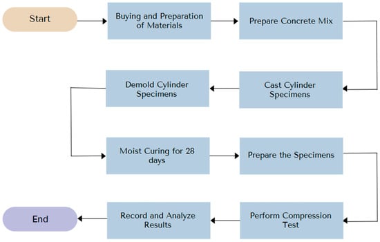 The data were collected through physical laboratory experiments, specifically compressive strength tests conducted on a Universal Testing Machine (UTM). Standardized procedures for batching, mixing, and curing were followed in accordance with ASTM Mix Design Evaluation [31], ASTM C33 [32], ASTM C330 [30], and ASTM C143 [33] guidelines to ensure accuracy. The compression test was conducted in accordance with ASTM C39 [34]. To isolate the influence of expanded polystyrene (EPS) replacement on compressive performance, the cement, water, and sand contents were held constant across all mixtures. The independent variables were gravel content, EPS content, slump value, and density. The compressive strength was designated as the dependent variable. Figure 3 summarizes the overall workflow of specimen production, curing, and testing. Each stage is described in detail as follows.