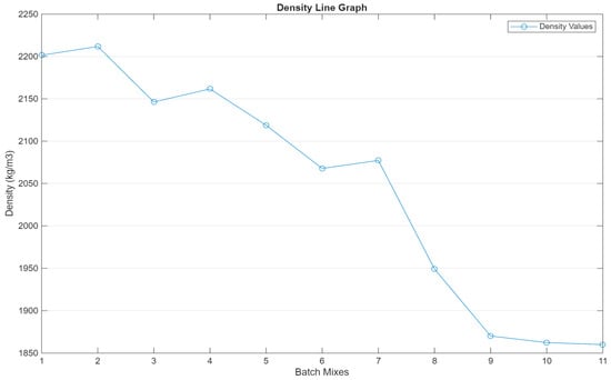 Line graph of the average density of the specimens in each batch mix.