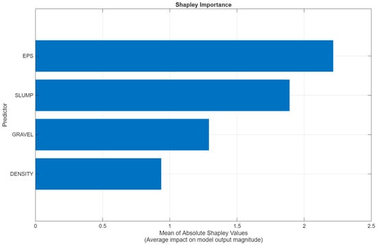 Relative importance explains which of the input variables carries the most weight in the compressive strength of the EPS-infused concrete. Initially, a calculation was performed in Excel using multiple linear regression. Based on that, the gravel and expanded polystyrene are most significant in the multiple linear regression model, while the slump test value and density are not significant. However, in this calculation, it could not include the variables cement, water, and sand since they were constant. In this case, a SHAP analysis in MATLAB was performed to identify which input parameter has the greatest influence on the compressive strength of EPS-infused concrete. Figure 7 shows the result of the SHAP analysis done in MATLAB. It can be observed that the EPS with a mean SHAP value of 2.22 has the greatest influence on the predictions of the compressive strength of EPS-infused concrete. Next is the slump value, which lies at a mean SHAP value of 1.89. The gravel content has a mean SHAP value of 1.29, and the density of the specimens has a mean SHAP value of 0.94. The larger the mean SHAP value, the greater the variable’s influence on the model. However, the analysis has identified that the sand, water, and cement variables do not affect the predictive model. Therefore, only the values for gravel, EPS, slump value, and density will be used in the dataset to predict the compressive strength of EPS-infused concrete. Despite these variables remaining constant, they are still essential to the concrete’s actual compressive strength.