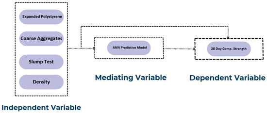 After this SHAP analysis, it has been identified that some variables did not affect the predictive model. Initially, seven variables were present: cement, water, sand, expanded polystyrene, gravel, the slump test, and the density of the specimens. After the SHAP analysis, only four variables, expanded polystyrene, gravel, the slump test value, and the density of the specimens, were found to have significance in the prediction of the model. For that reason, the cement, water, and sand variables are removed from the equation and treated as constants. Figure 9 shows the final conceptual diagram of the research.