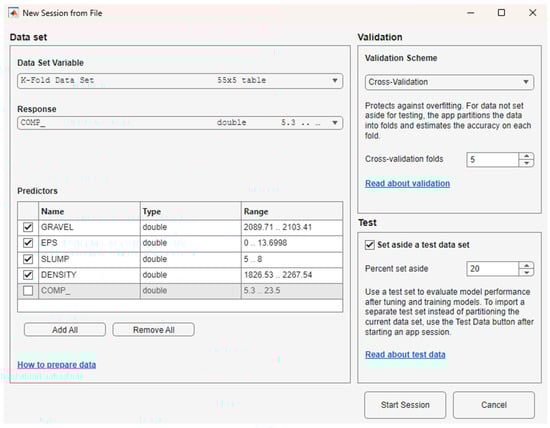 In Step 3, the artificial neural network (ANN) model with 5-fold cross-validation was developed in MATLAB R2025a using the Regression Learner App. In MATLAB, the input parameters and the output parameters were identified. The input parameters were the EPS content, gravel content, slump test values, and the density of the specimens. The output variable is the compressive strength.
