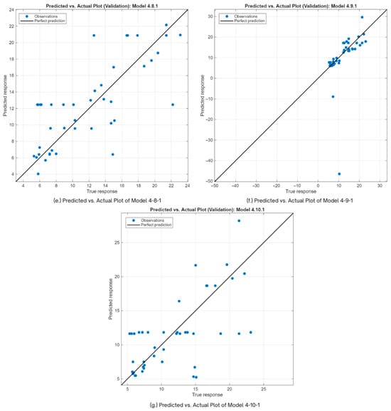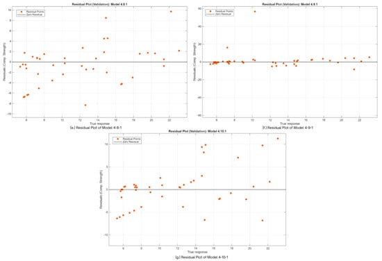 Moreover, Figure 13 shows the residual plots of the seven models evaluated in the study. Models 4-6-1, 4-7-1, and 4-9-1 exhibit visible clustering in the range 6–8 MPa, indicating a slight predictive bias in this range. Models 4-4-1, 4-5-1, 4-8-1, and 4-10-1 show linear patterns in the data that shift from negative to positive residuals. However, model 4-5-1 shows a very minimal observable pattern and clustering, indicating less bias and a good model. With that, in the current observation, model 4-5-1 tends to perform better than the other six models evaluated.