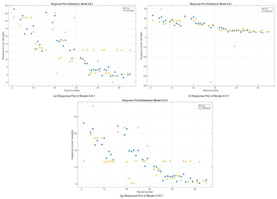 Figure 12 presents the response plots of the seven models evaluated in the study. The response plots visually showcase the comparison between the actual compressive strength values and their predicted values from 0% to 50% replacement. It can be observed that all the models had the majority of their predicted values closely follow the actual values. However, it can be observed that all the models exhibit flattening in some areas; the greatest flattening is observed in models 4-4-1, 4-8-1, and 4-10-1. The remaining models had minimal flattening values. This flattening indicates inconsistencies in the predictive capabilities of these models. Some models, like 4-6-1, 4-7-1, and 4-9-1, have some values that are very far from the actual value. With that being said, based on observation, the best model in this regard is 4-5-1, with very minimal flattening and most of its predicted values following the actual values closely.
