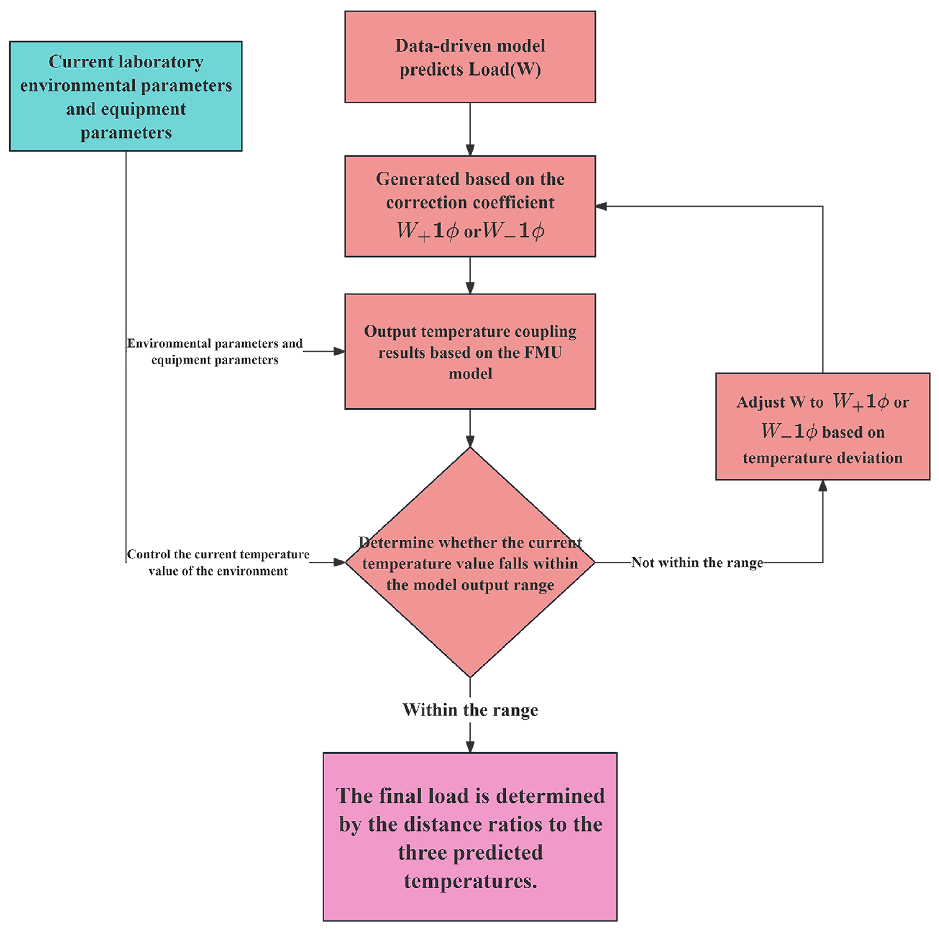 - If the measured temperature lies outside this range, the value of W is adjusted in the corresponding direction to or . Three new candidate load values are then regenerated based on the updated W, and the judgment is repeated. This process continues until the measured temperature falls within the range of the three predicted temperatures. The final predicted load is determined according to the distance ratio between the measured temperature and the three predicted temperatures.