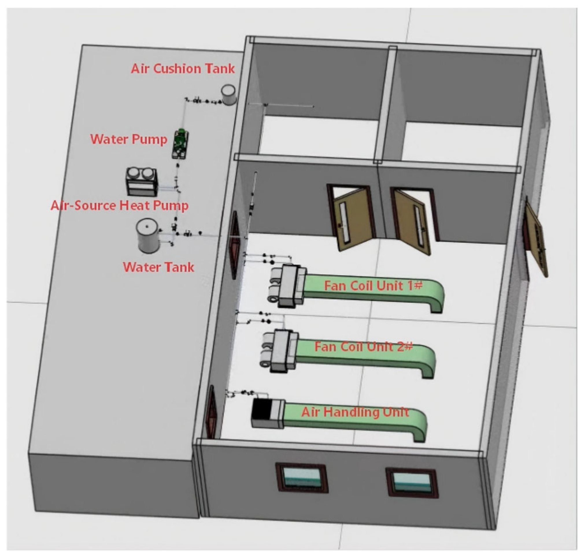 - Yang, G.; Xiao, J.; Gao, J.; Cheng, J.; Zou, Y.; Xu, X.; Chen, G. Multivariate Linear Optimal Control Approach in Small-Scale ASHP-Integrated Central Air Conditioning Systems: Enhanced Temperature Regulation and Energy Efficiency. J. Build. Eng. 2025, 112, 113764. [Google Scholar] [CrossRef]