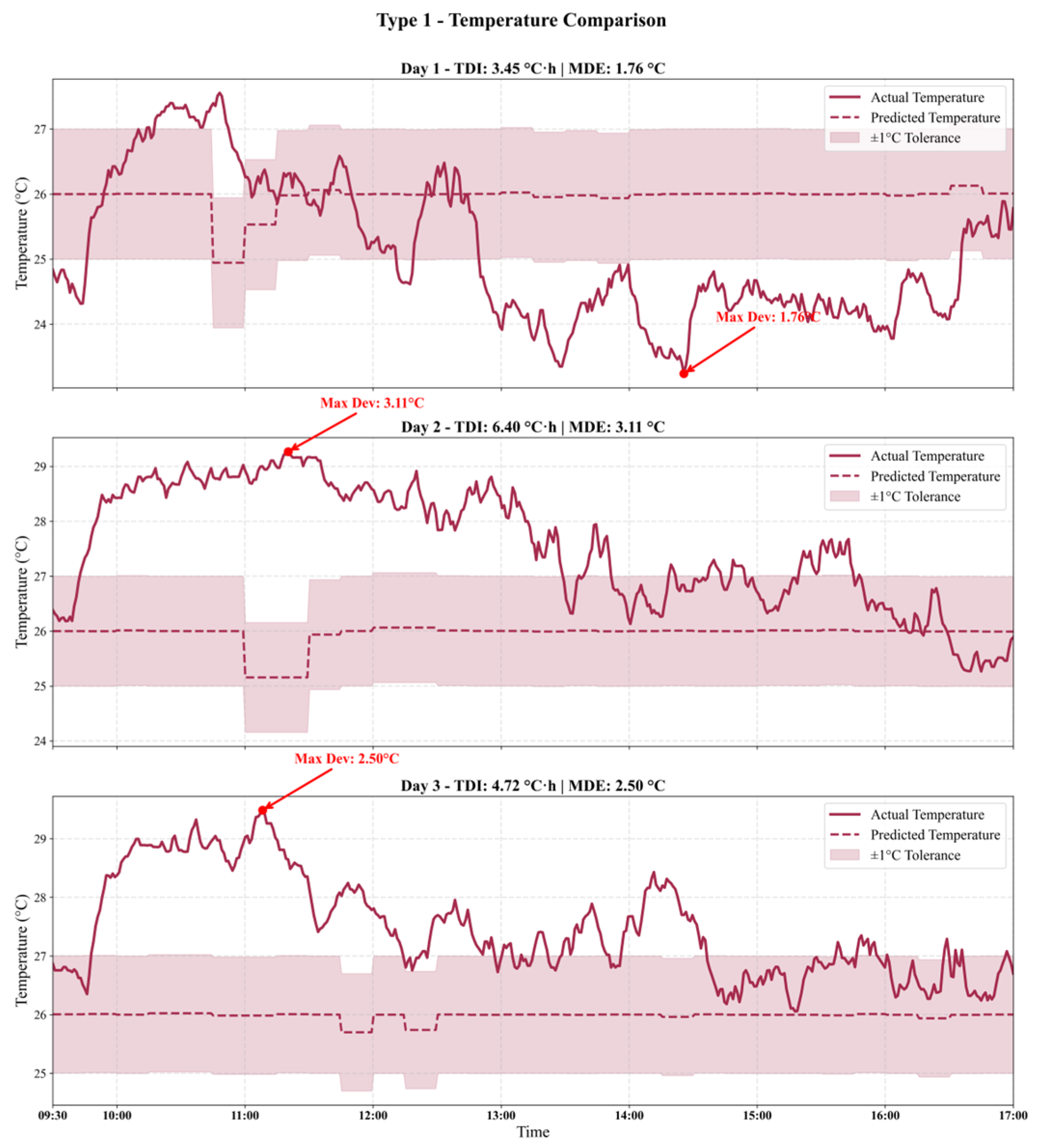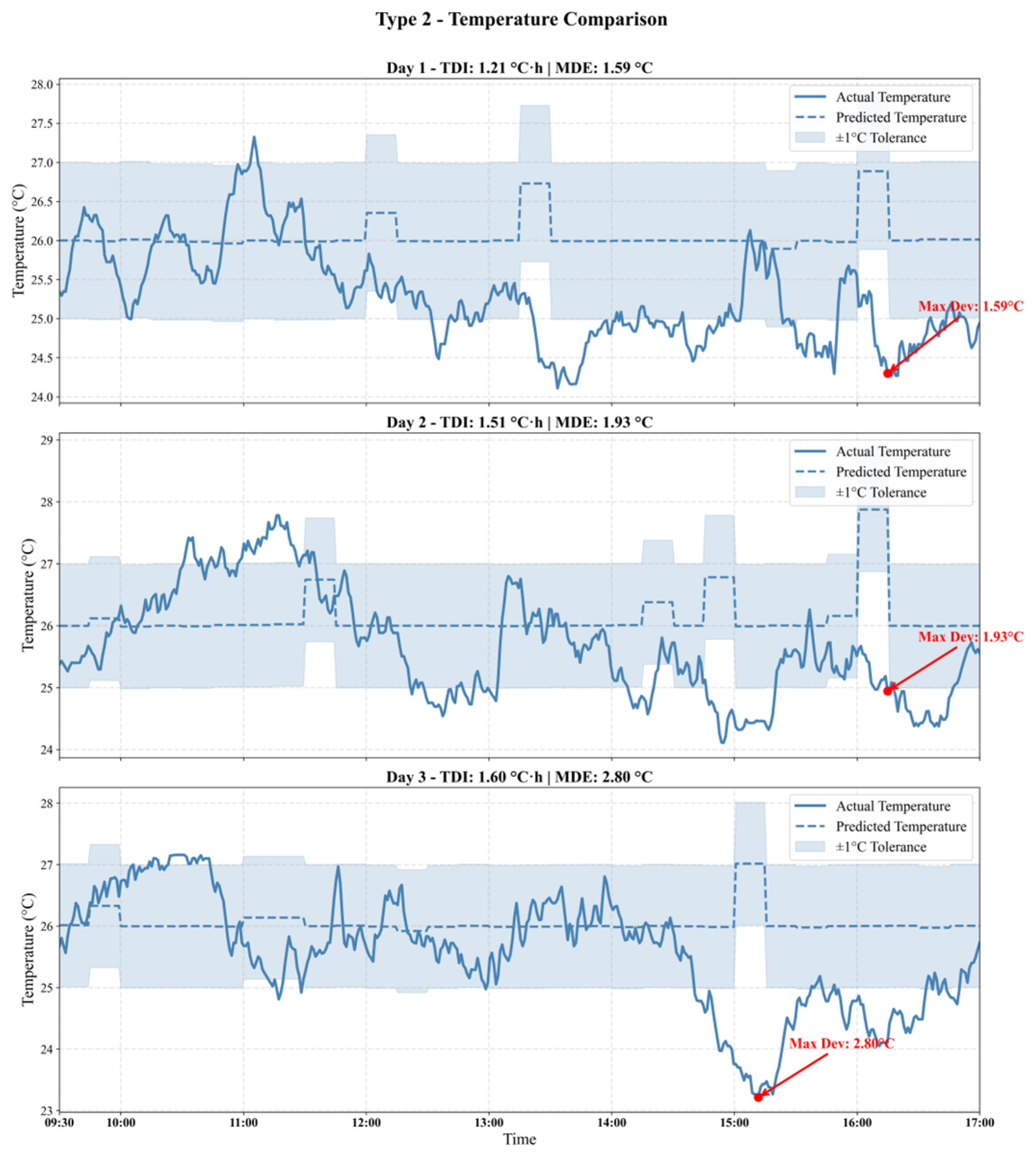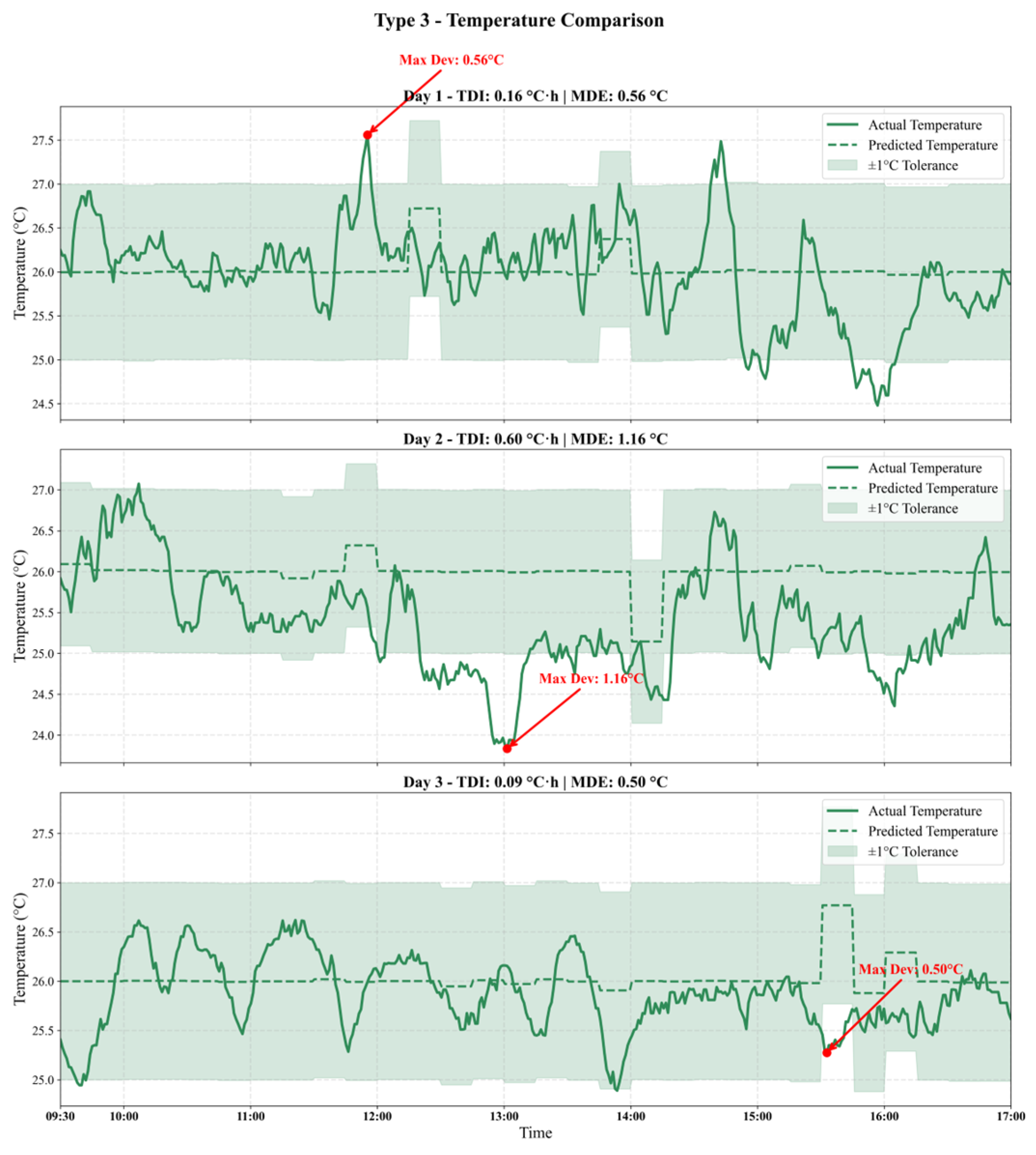 - Simulation initialization: At the start of each test window, the model’s initial system temperature was calibrated to match the actual measured temperature at the first minute of the period.