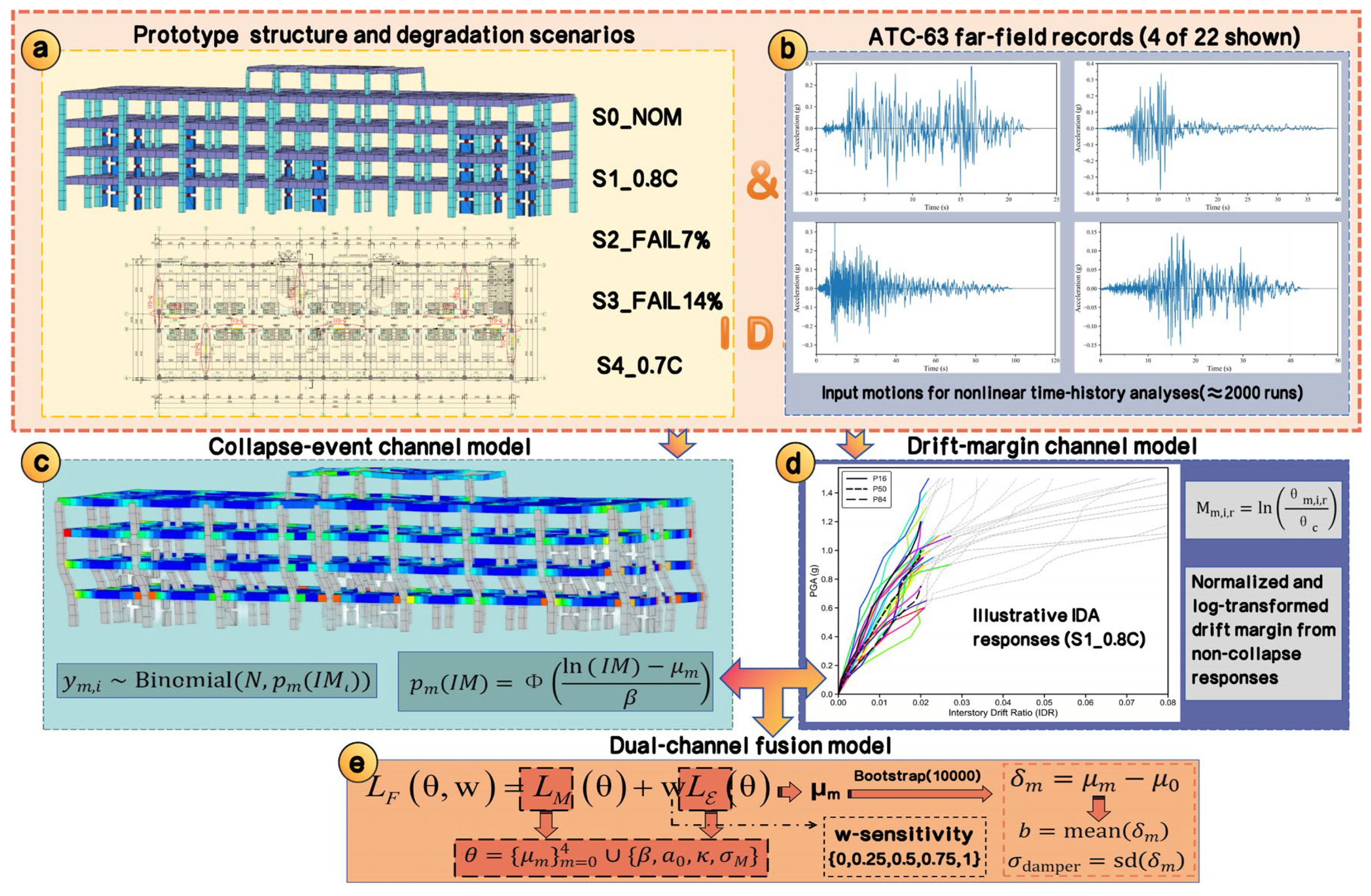 - This study develops three complementary frameworks—the collapse event channel model, the drift-margin channel model, and the dual-channel fusion model—which are based on binary collapse outcomes, continuous deformation information from non-collapse records, and their joint constraints, respectively. These frameworks are used to estimate the scenario-specific capacity scale parameter μm and to report interval results, thereby explicitly accounting for the uncertainty induced by the limited sample size.