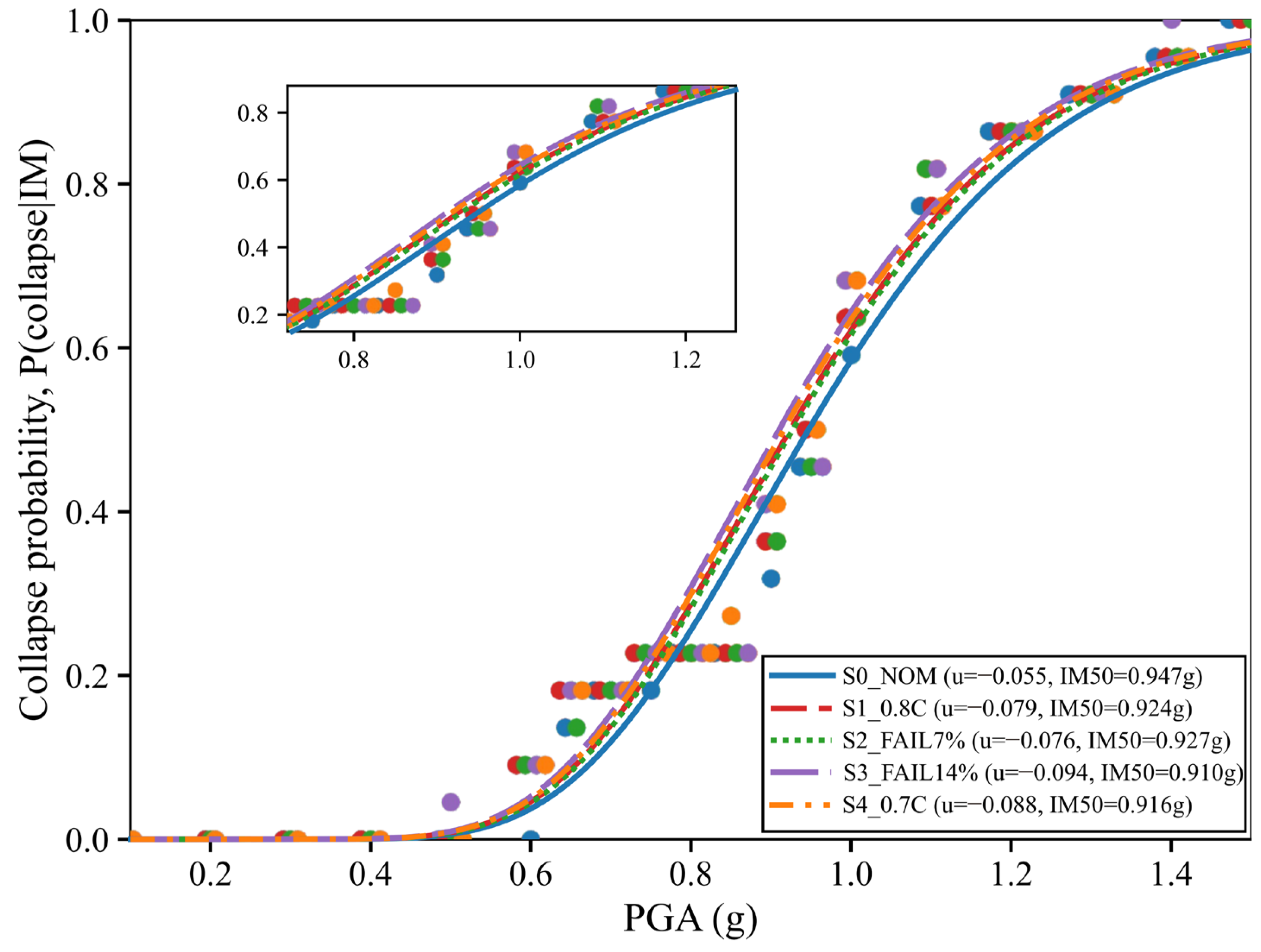 - This study establishes five representative damper-state scenarios, including a baseline case, global degradation cases, and local failure cases, and conducts cross-scenario collapse-capacity assessments under a unified IDA protocol. This setup enables direct comparison of collapse capacity across scenarios on a consistent intensity scale and ensures the comparability of the results.