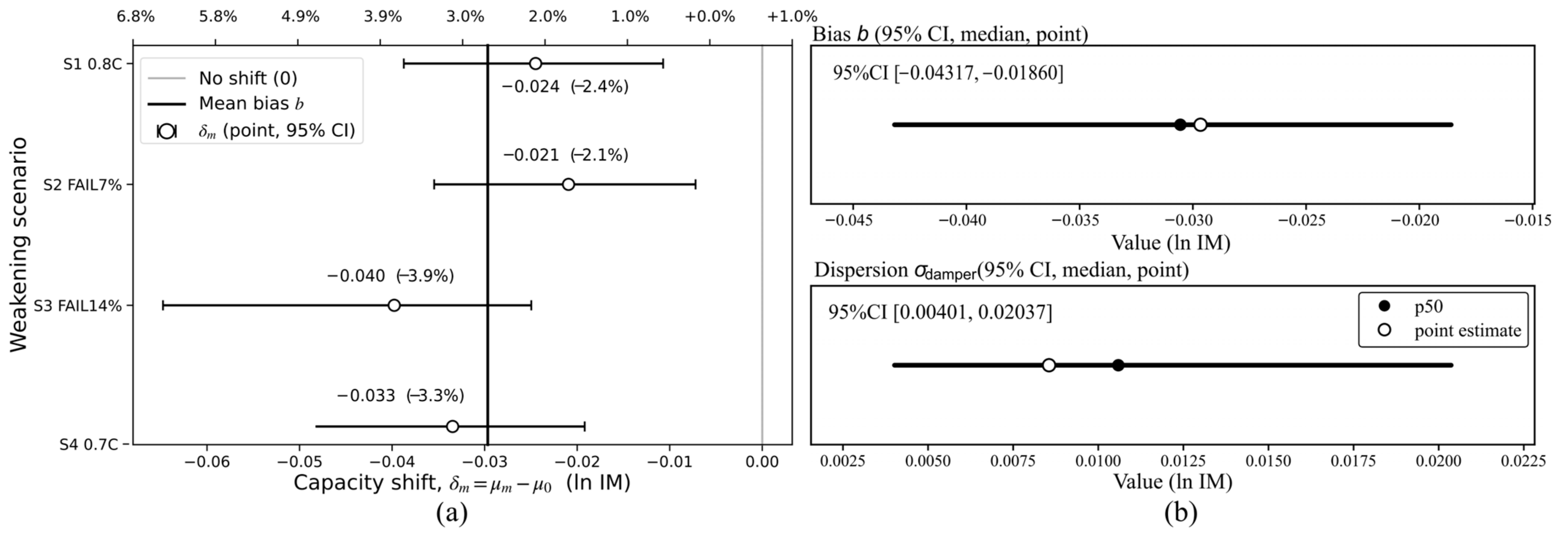- The median shift δm is defined as μm − μ0 with respect to the baseline scenario, and the multi-scenario effects are summarized using b = mean(δm) and σdamper = sd(δm), with interval estimates provided. The results show that the main impact of performance deviations on collapse capacity is a systematic downward shift in the median capacity, with the median collapse intensity reduced by approximately 2.4% to 2.9%. The differences between degradation pathways are of secondary magnitude and can be bounded by the interval estimates. The dual-channel fusion model maintains stability in key outputs under varying weight w. Therefore, this study provides parameterized collapse capacity results that can be directly recalculated, which can be used for updating collapse fragility under degradation conditions, as well as for unified parameter input and uncertainty expression in collapse-related risk and reliability quantification.