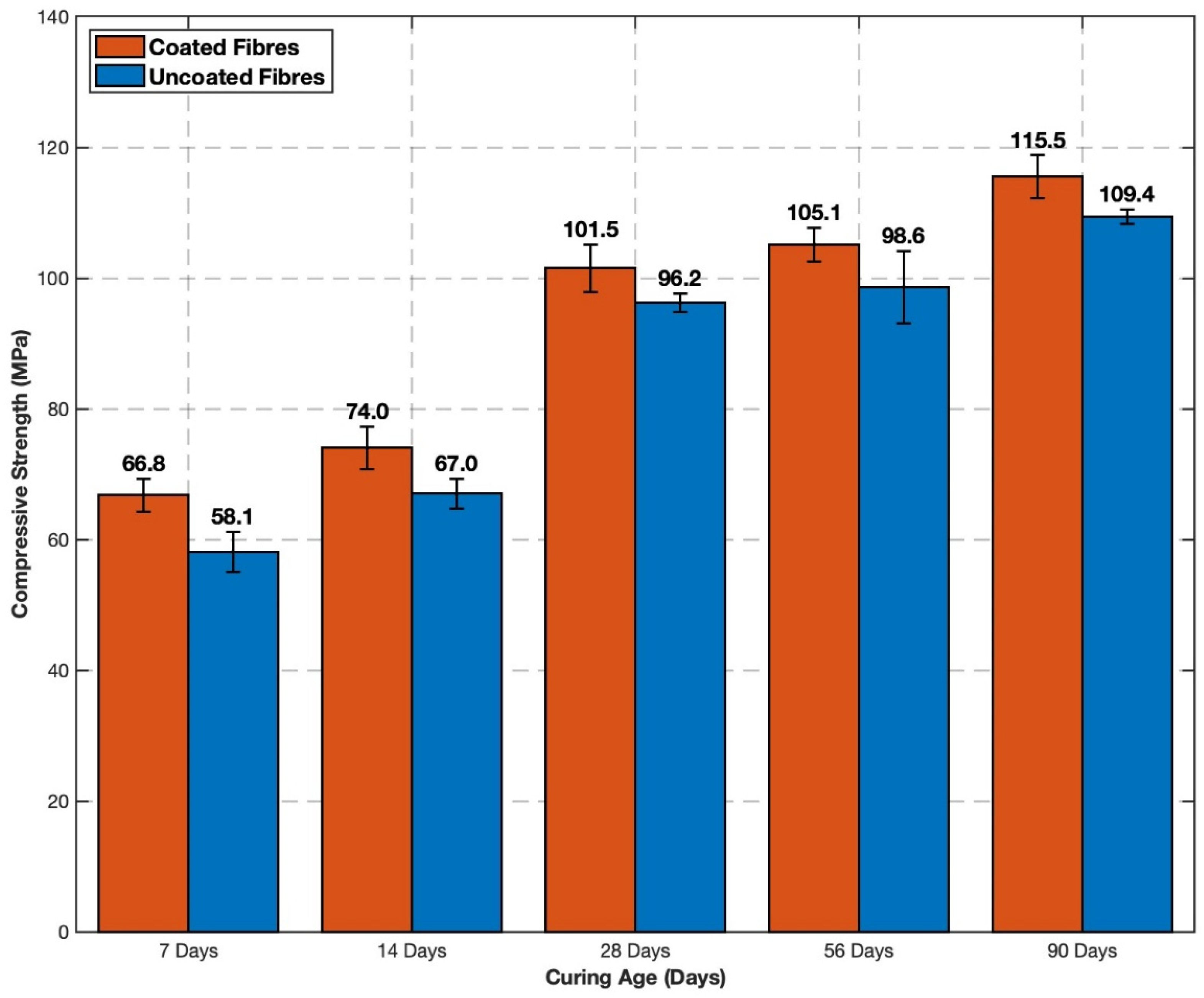 - At later ages, compressive strength gains stabilised at approximately 5–7% between 28 and 90 days, while flexural performance at 28 days remained significantly higher for coated specimens, with improvements in the range of 29–32%.