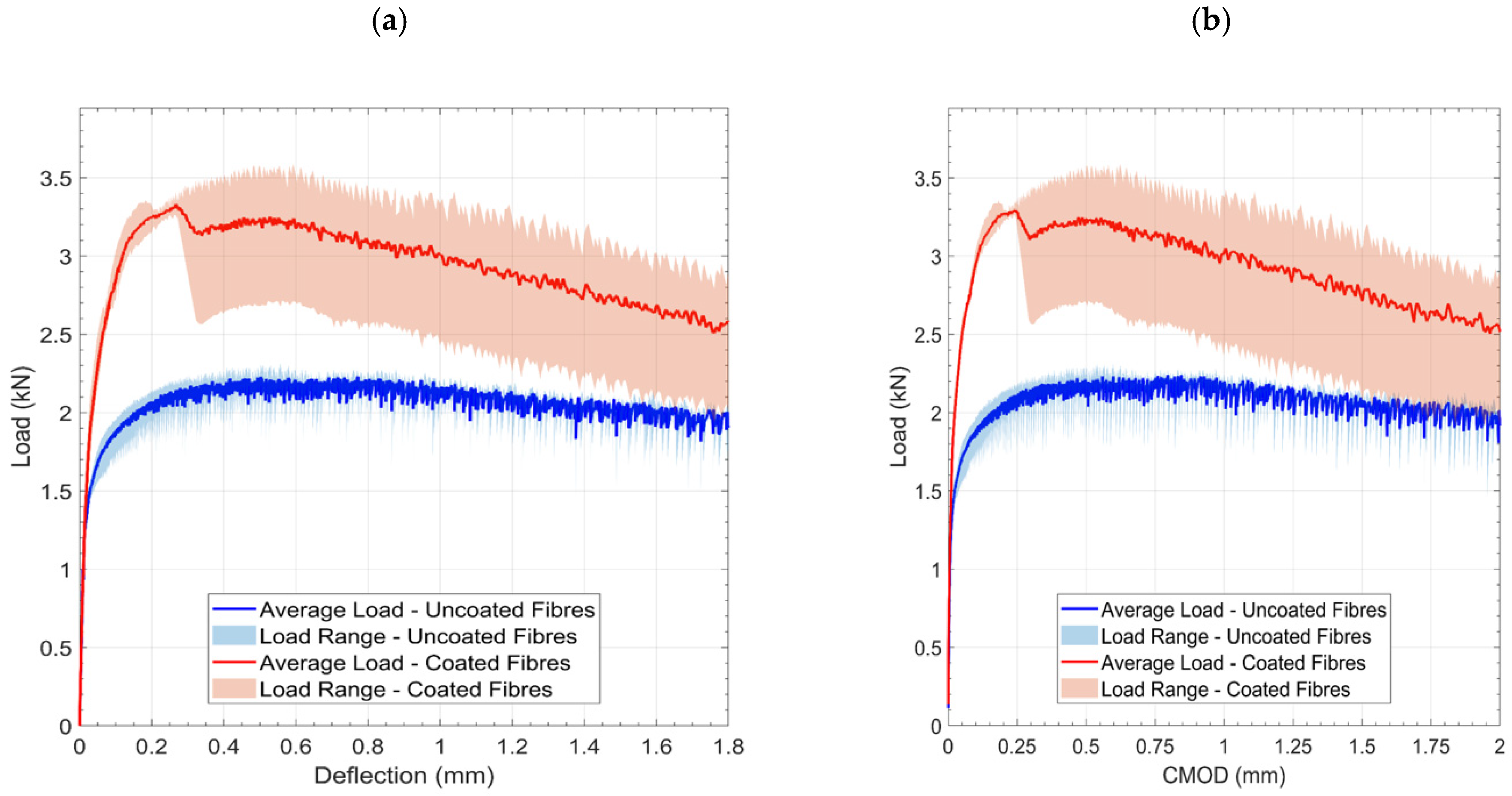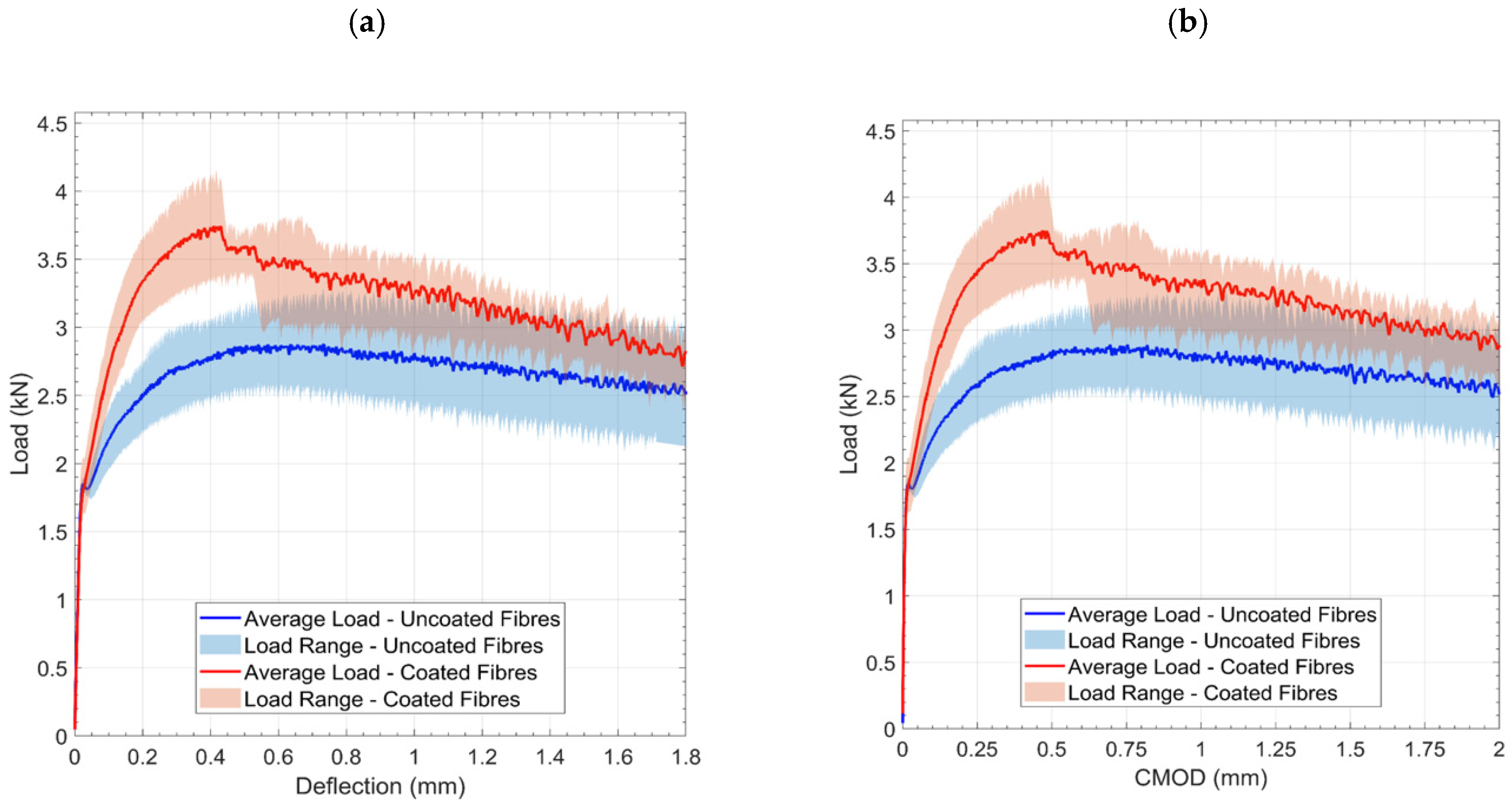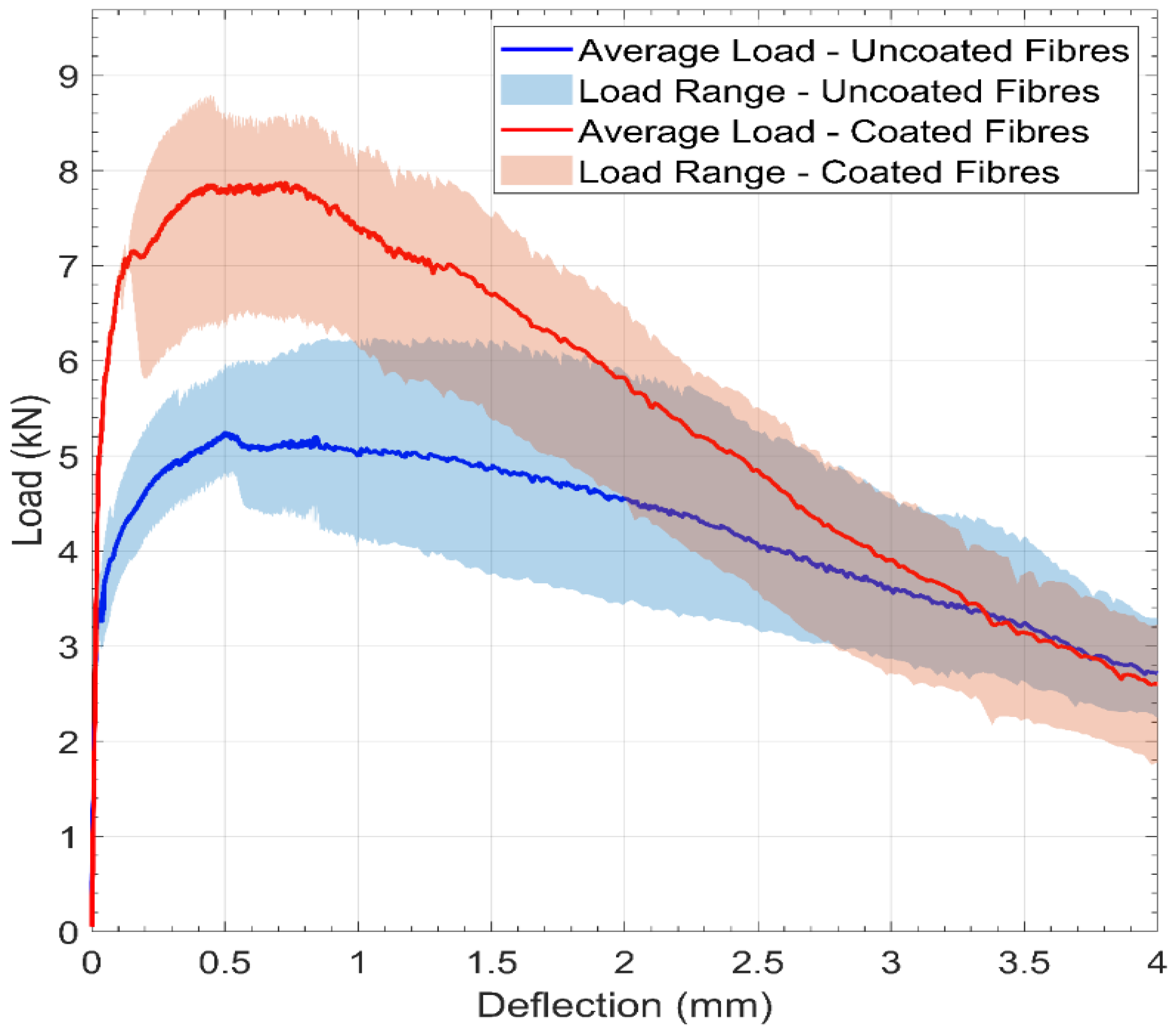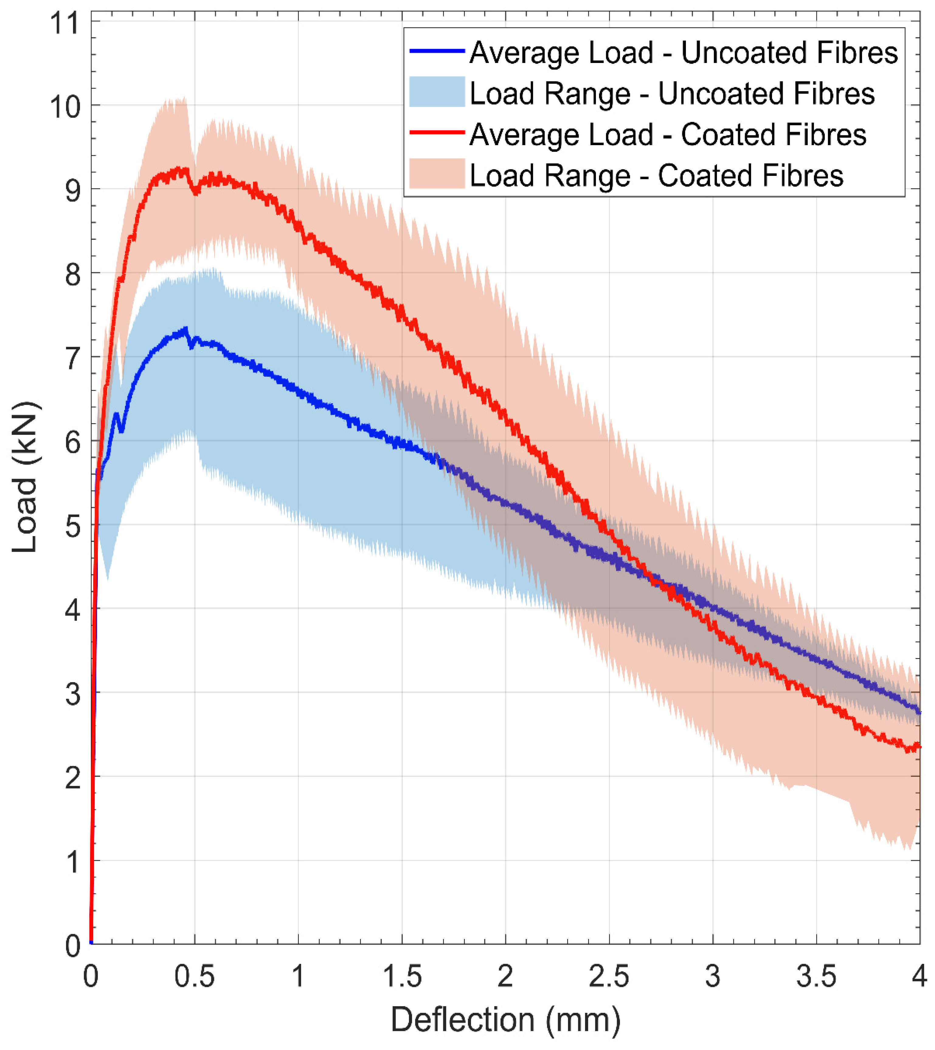 - The close agreement between the results of three-point bending and four-point bending tests confirms that the beneficial effect of the fibre coating is robust across different structural loading configurations.