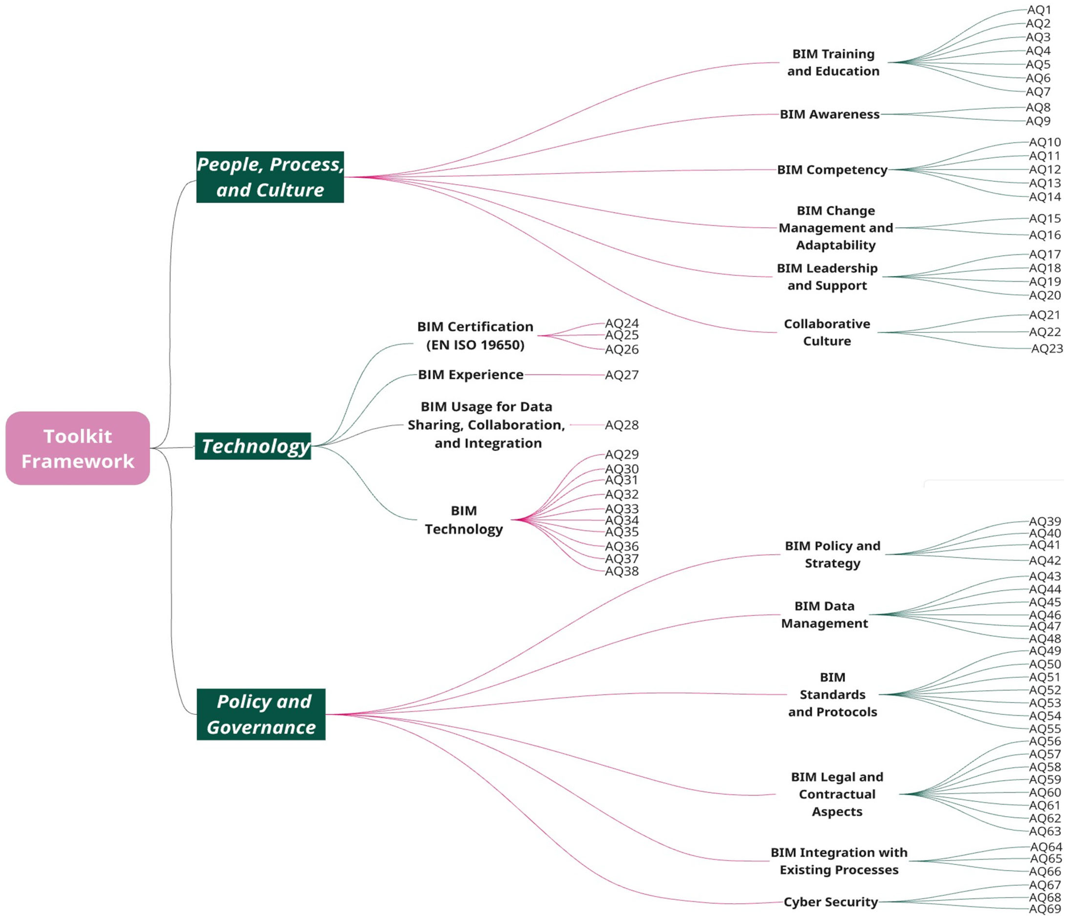 | Policy and Governance | BIM Policy and Strategy | No or less familiarity with defined policy or strategy. | Initial strategy development; draft policies. | Policies aligned with business objectives. | Fully integrated strategy with regular updates. | Dynamic strategy evolving with the industry. |