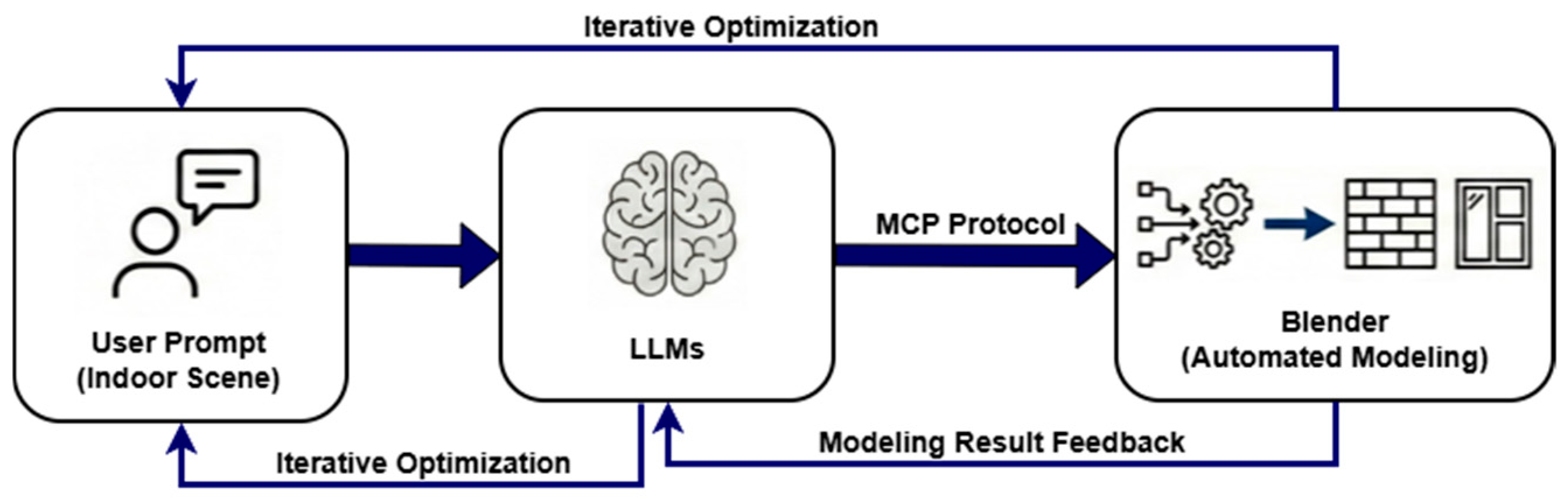Figure 2. Indoor scene requirements provided via natural language are parsed by the LLM into structured instructions, including component geometry, layout, and material specifications. These instructions are executed in Blender to create, arrange, and assign materials to components such as walls, doors, and windows. Modeling results can be fed back to the LLM for iterative adjustments if needed.