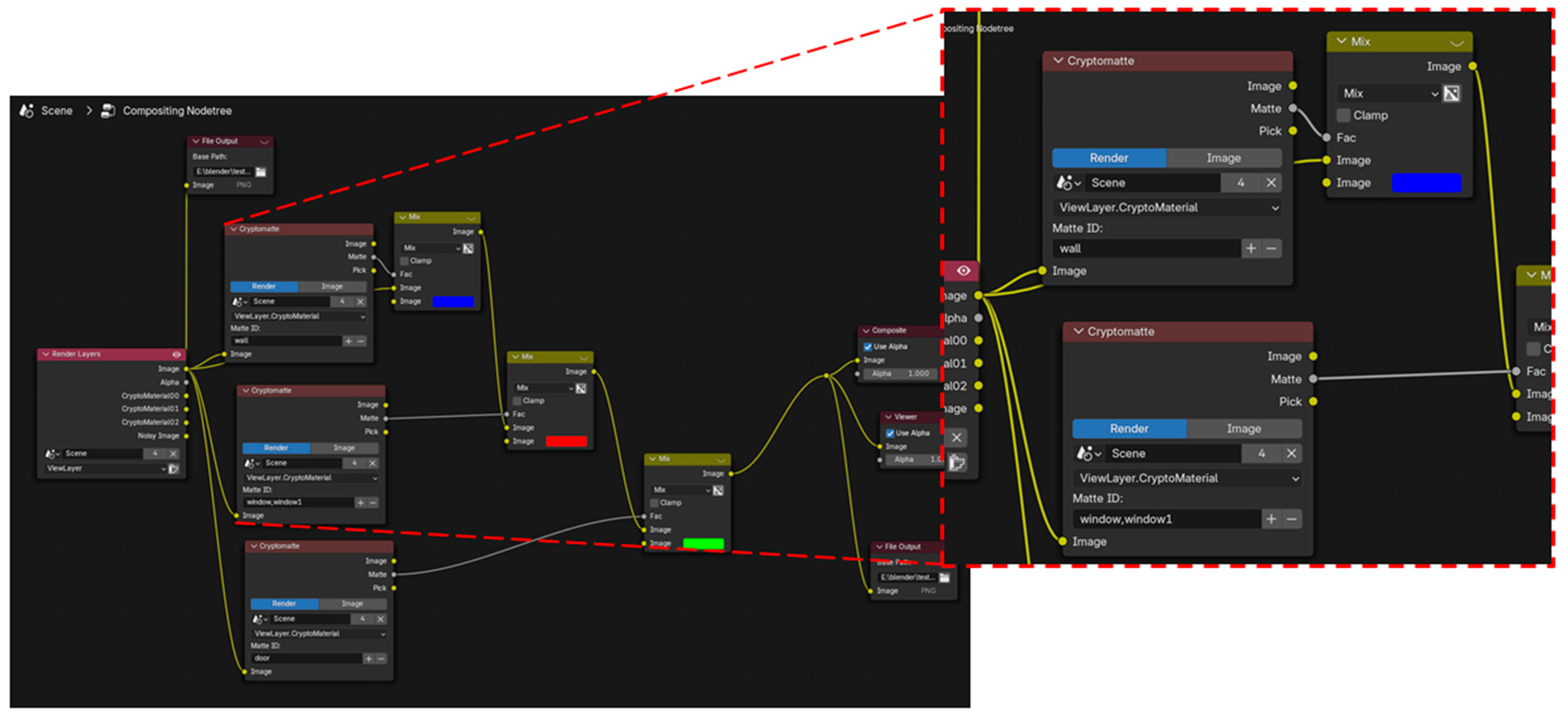 Figure 3, Shader and Compositing Nodes in Blender, combined with Cryptomatte, assign unique IDs to walls, windows, and doors. Cryptomatte nodes automatically extract masks for each component, which are merged via Mix nodes to produce customized annotation colors. The resulting material ID maps are exported along with rendered images, ensuring pixel-level alignment for automated dataset construction.