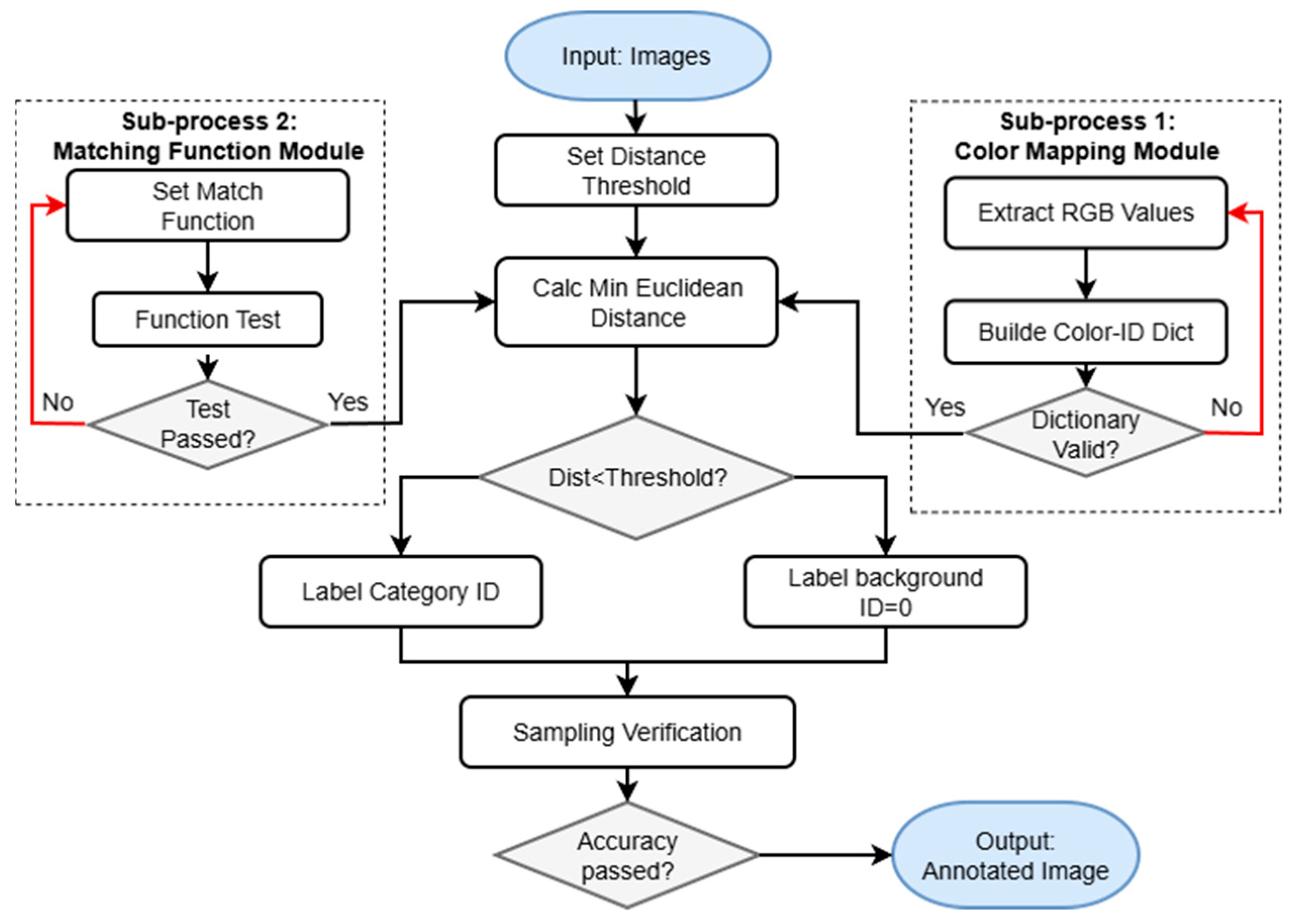 Following the extraction of characteristic color references, an automated annotation procedure is implemented to convert the multi-channel material ID maps into single-channel grayscale labels. To achieve this, a class-mapping dictionary is first constructed based on the calibrated RGB values of the walls, windows, and doors identified in the previous stage. This dictionary binds the specific color signatures of each component category to a unique class ID, establishing a standardized lookup table for the subsequent batch-processing script.