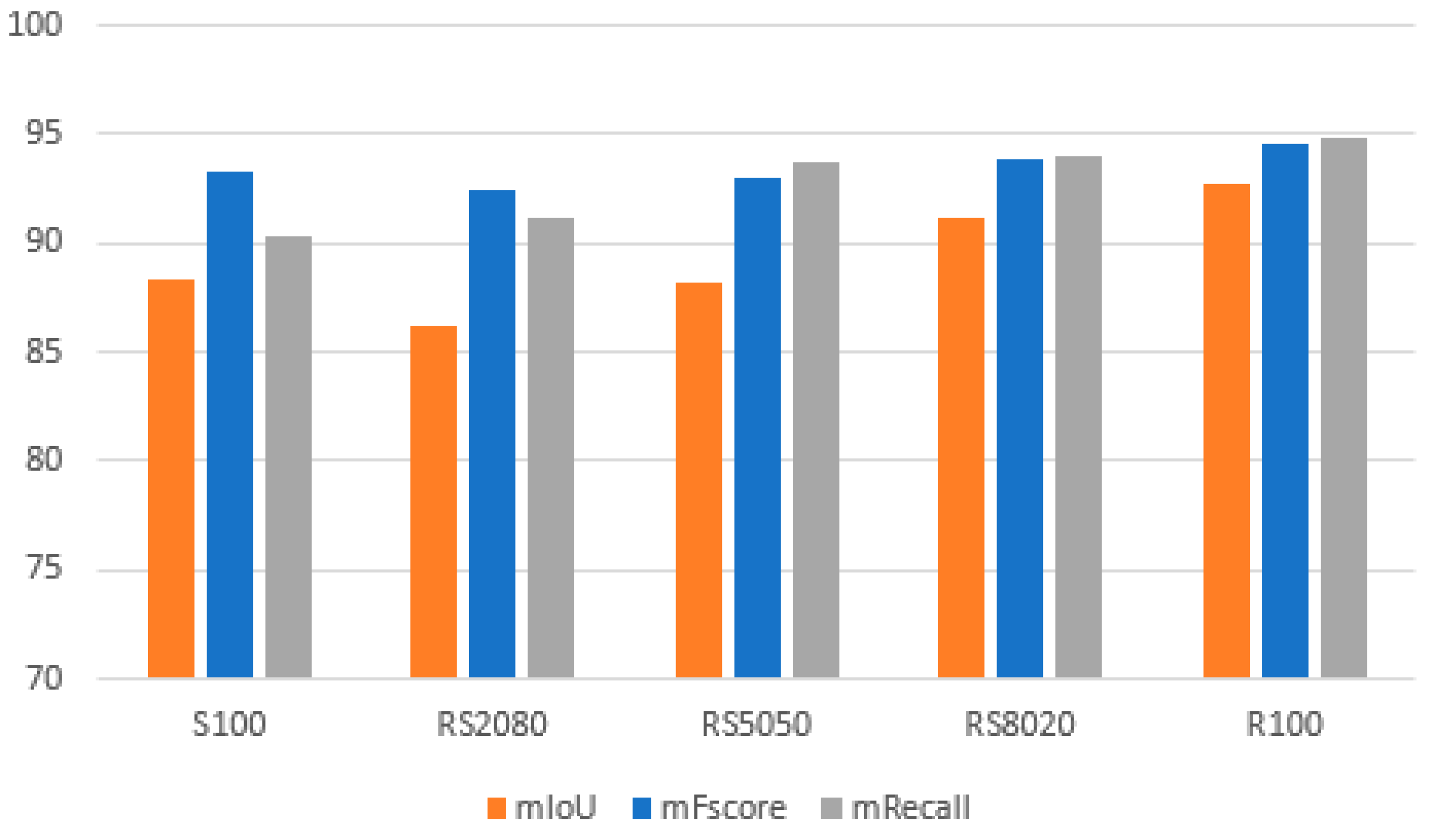 To quantitatively analyze the impact of varying proportions of real and synthetic data on segmentation performance, several key evaluation metrics were employed. These include mean Intersection over Union (mIoU), mean F-score (mFscore), mean precision (mPrecision), and mean recall (mRecall), which collectively reflect the model’s overall accuracy, component detection capability, and prediction reliability. By evaluating these metrics across different dataset configurations, a comprehensive comparative analysis was conducted to assess the effectiveness of the synthetic data integration.
